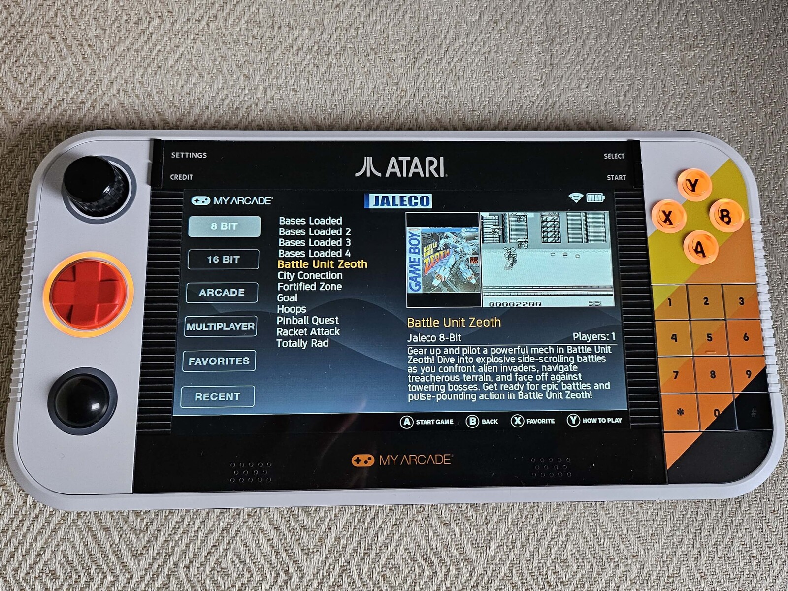 A 200 beépített játék a játékosok széles körét szolgálja ki, és valóban mindenki számára kínál valamit. Az Atari saját címei mellett a rendszer a Piko és a Jaleco több játékát is tartalmazza, bár nem világos, hogy miért pont ezeket a játékokat választották. A menüben minden cím az eredeti borítójával együtt jelenik meg - például a Battle Unit Zeoth Game Boy változata -, egy rövid automatikus lejátszási videó és egy angol nyelvű leírás mellett. A főmenü olyan kategóriákra van osztva, mint az Atari Recharged, Atari, Balls of Steel, Pac-Man, Jaleco, Piko és Settings. Az almenük tovább rendszerezik a könyvtárat 8 bites, 16 bites, Arcade, Multiplayer, Favorites és Recently Played kategóriákba. Aki ismeri az olyan frontendeket, mint a RetroArch vagy a Retro Deck, otthonosan fogja érezni magát: minden szépen strukturált és gyorsan elindul.