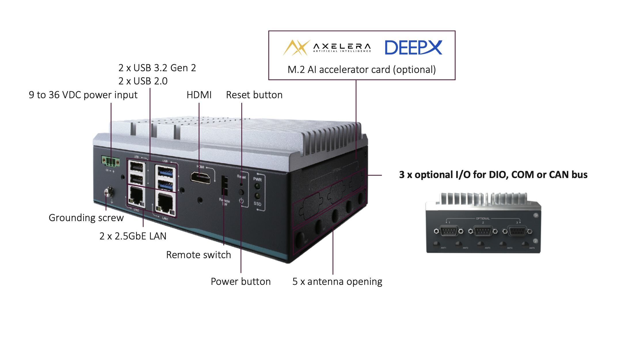 Az ipari mini PC 8 vagy 16 GB LPDDR5 SDRAM memóriával van felszerelve, a tárolási igényeket pedig egy 2,5 hüvelykes, M.2 2280-as, valamint egy mSATA foglalat oldja meg. A vezeték nélküli hálózati kártyák elhelyezésére egy M.2 2230-as foglalat is jelen van. A passzív hűtésű rendszer alumíniumból és acélból készült, ami a mini PC-nek nagyon ipari megjelenést kölcsönöz, ami megfelel a tervezett környezetnek. Ezenfelül egy nano SIM-helyet is kapott. A kínált I/O a következő: