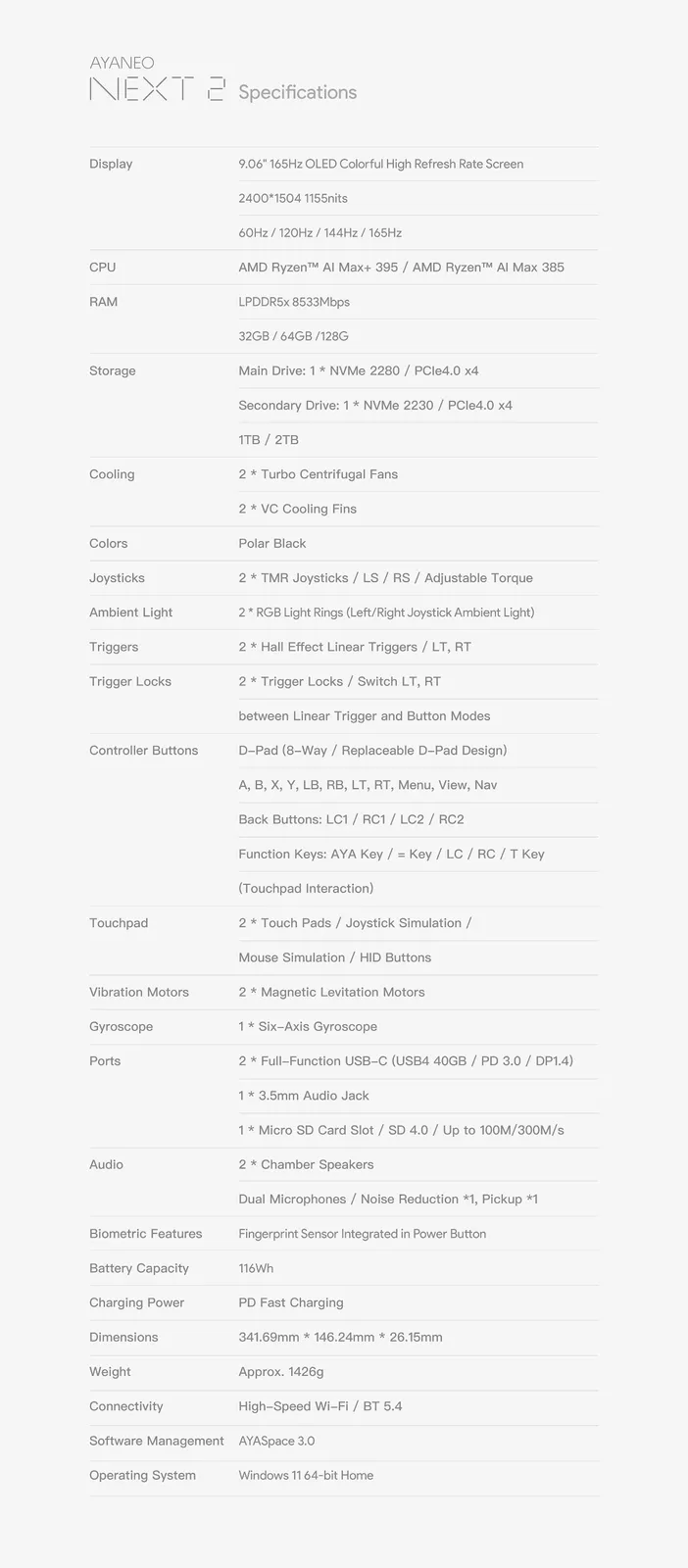 Konkrétan az Ayaneo a Next 2-t vagy a következővel kínálja Ryzen AI Max 385 vagy a Ryzen AI Max+ 395, akárcsak a OneXPlayer Apex és a GPD Win 5 előtte (jelenleg 2399,99 dollár az Amazonon). A Next 2 9,06 hüvelykes OLED kijelzővel és 116 Wh-s külső akkumulátorral tér el társaitól. Összességében a Next 2 341,69 x 146,24 x 26,15 mm-es és körülbelül 1,43 kg súlyú. A teljes műszaki részleteket az alábbi műszaki adatlapon találja.