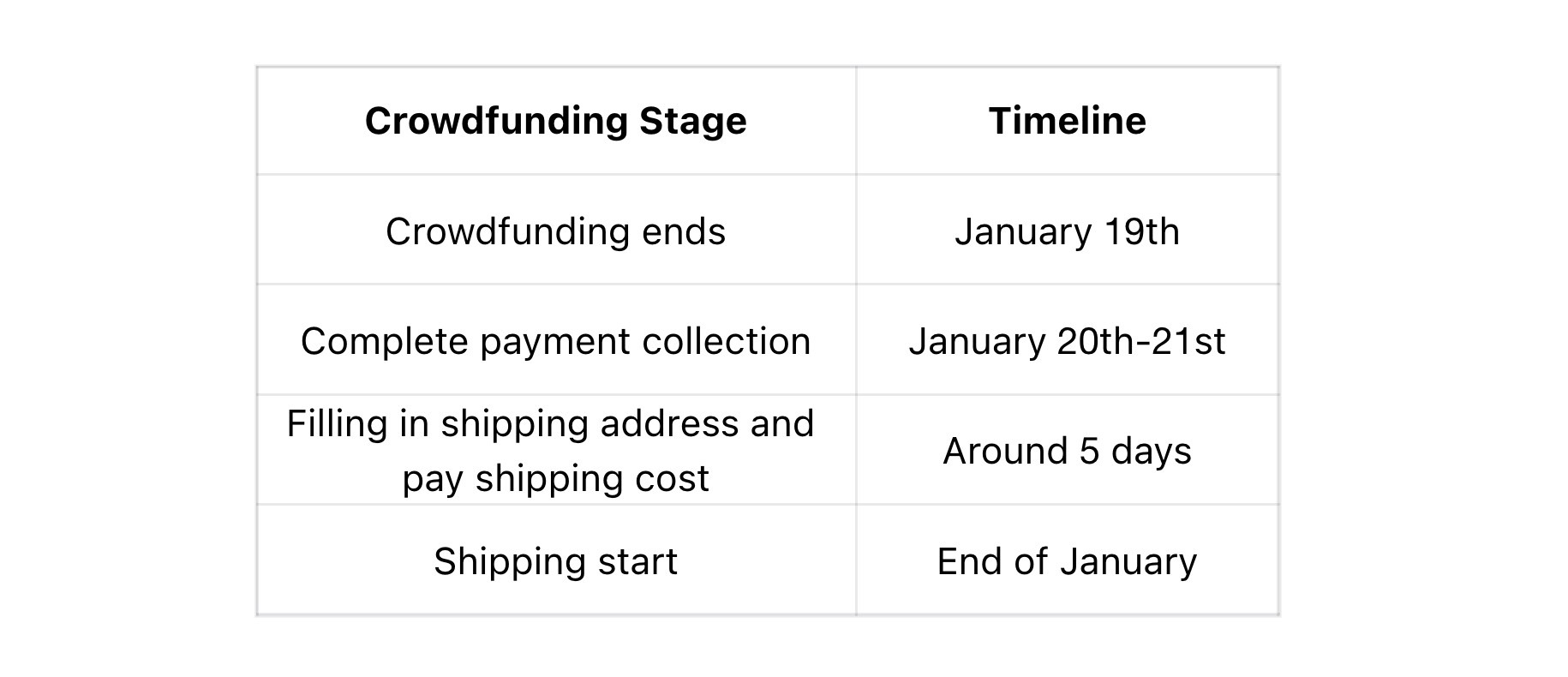 Úgy tűnik, az Indiegogo szabályai szerint a kifizetések beszedésének a kampány végét követő 15 napon belül kell megtörténnie. Ezt követően további 5-15 napot vesz igénybe, hogy a támogatók megadják a szállítási adatokat és kifizessék a szállítási díjat. A fentiek alapján a szállítás február végén kezdődhet meg.