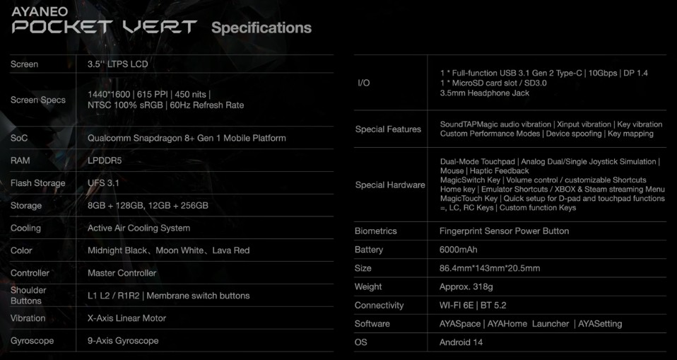 Az Ayaneo Pocket Vert további jellemzői közé tartozik a 9 tengelyes giroszkóp, a Wi-Fi 6E, a Bluetooth 5.2 és az X-tengelyes lineáris motor. A kéziszámítógép 6000mAh-s akkumulátorral rendelkezik majd, akárcsak a Ayaneo Pocket DMG és a dobozból kivéve a Android 14-et futtatja.