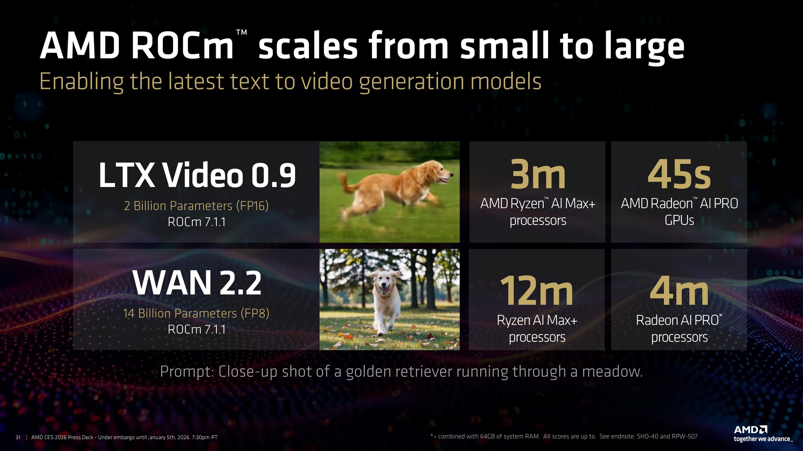 A ROCm 7.1 lenyűgöző teljesítményt mutatott az olyan szövegből videót generáló modellekben is, mint az LTX Video 0.9 és a Wan 2.2, és mindössze 3 perc alatt teljesítette a kérés követelményét a következő rendszerben Ryzen AI Max+ APU-kon és 45 másodperc alatt a Radeon AI Pro GPU-kon.