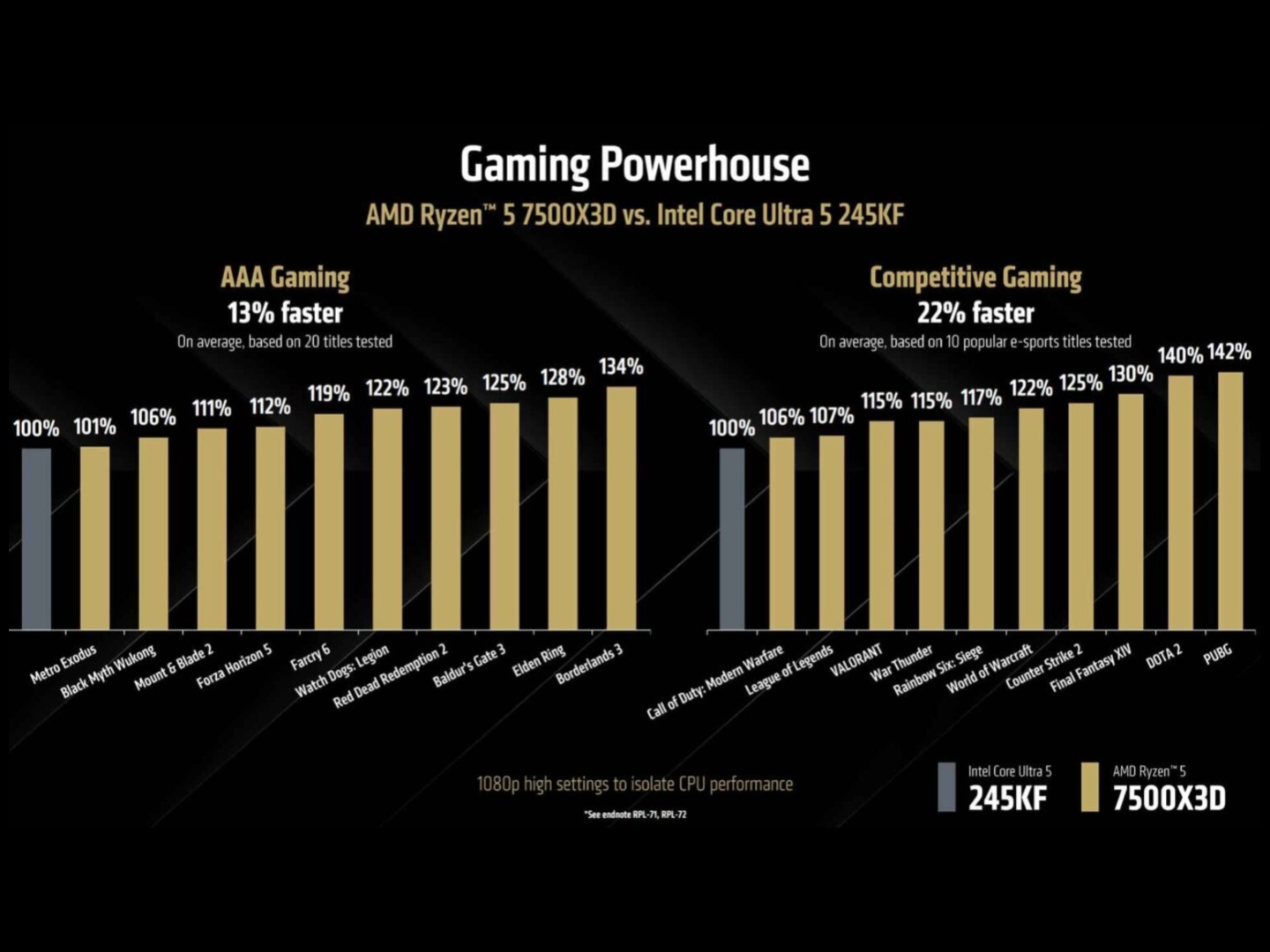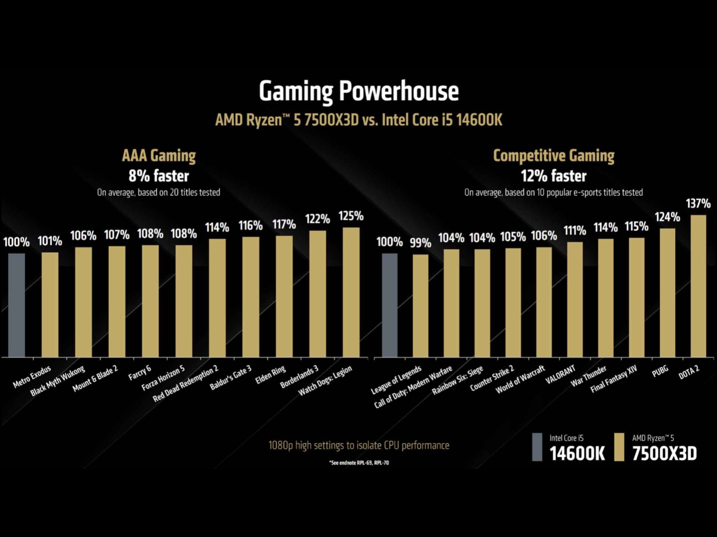 Hasonlóképpen, a Core i5-14600K-hoz képest az AMD állítása szerint a Ryzen 5 7500X3D 8%-kal gyorsabb az AAA és 12%-kal gyorsabb a kompetitív játékokban.