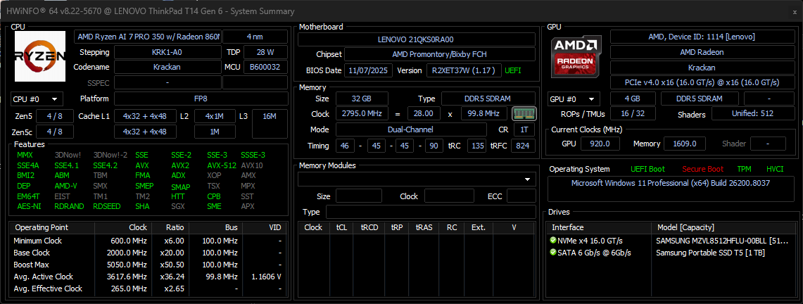| Lenovo ThinkPad T14 Gen 6 AMD AMD Ryzen AI 7 PRO 350 ⎘ AMD Radeon 860M ⎘ 32 GB Memória, 512 GB SSD | Amazon: List Price: 1800 Euro | 1.4 kg | 22.1 mm | 14.00" 1920x1200 162 PPI | |