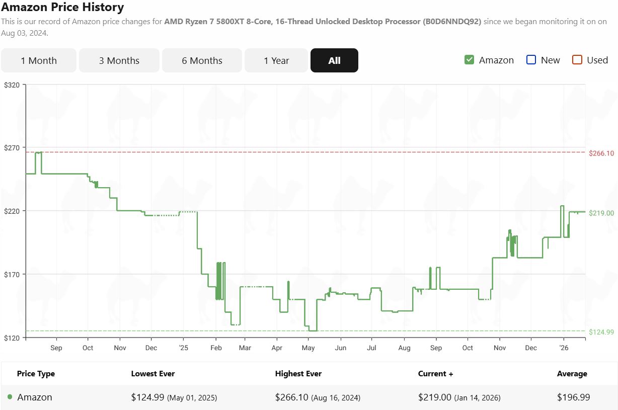 Ugyanez történt a 8 magos Ryzen 7 5800XT esetében is. A CPU jelenleg 219 dolláron áll az Amazonon. A CPU még 2025 májusában érte el eddigi legalacsonyabb árát, 125 dollárt, így a jelenlegi ár több mint 75%-kal magasabb.