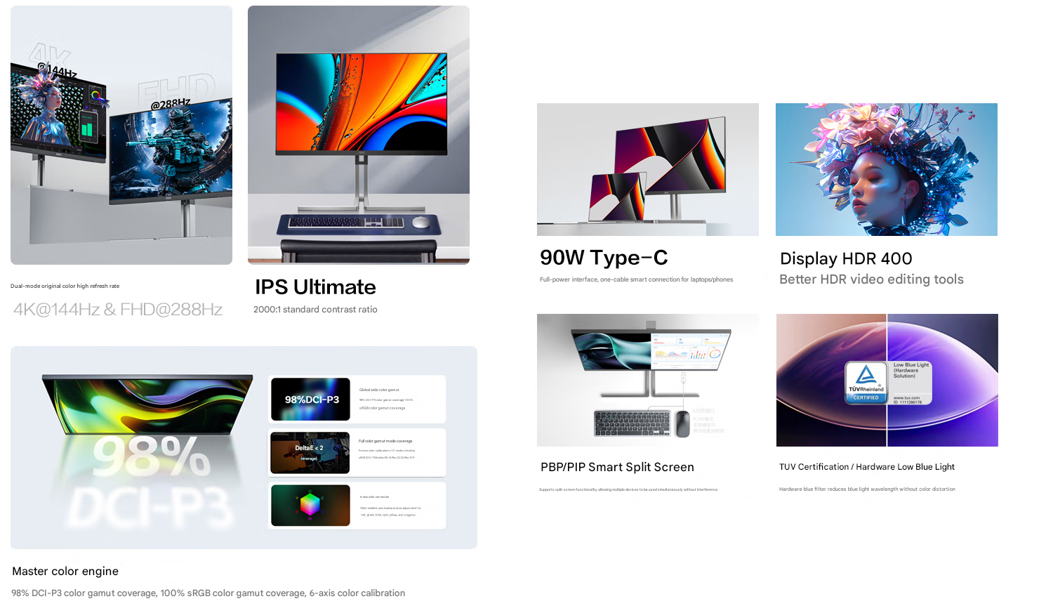 A 4K felbontásban a monitor frissítési frekvenciája 144 Hz-re csökken, de a nagyobb tisztaság mellett ez az üzemmód inkább professzionális munkaterhelésre alkalmas. Ha már itt tartunk, az AOC U27U3XD 27 hüvelykes IPS panelje a 100%-os sRGB és 98%-os DCI-P3 lefedettséggel.
