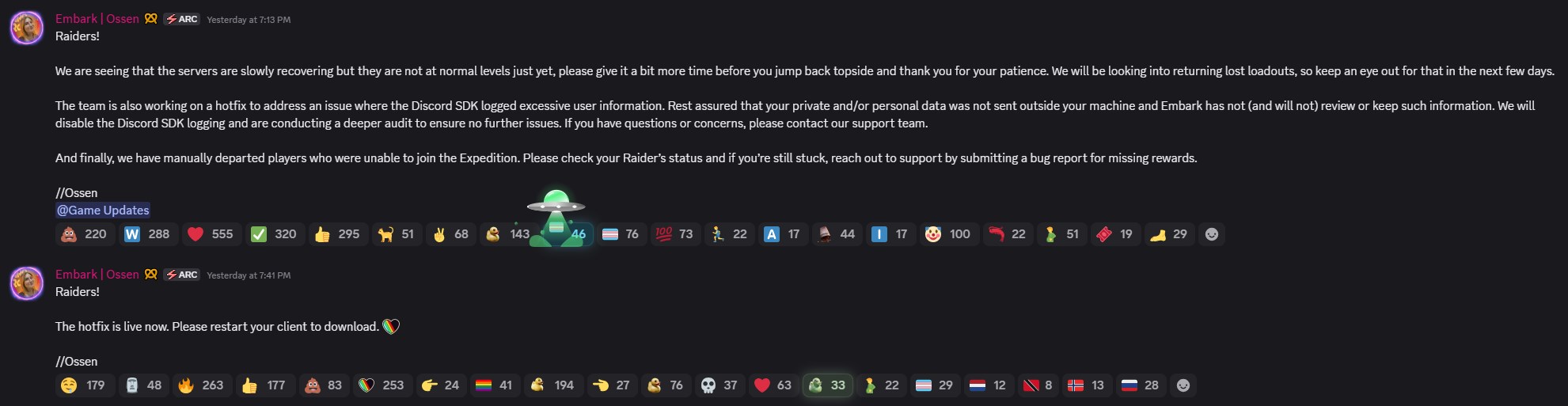 Nem sokkal a probléma nyilvánosságra kerülése után az Embark Studios reagált, és megerősítette, hogy a Discord SDK a tervezettnél több felhasználói információt naplózott. A stúdió biztosította a játékosokat, hogy az adatokat soha nem továbbították a felhasználó számítógépén kívülre, és hogy a fejlesztők soha nem férhettek hozzá az üzenetekhez, és nem is tárolták azokat. Egy hotfixet is kiadtak, amely kikapcsolja a problémás naplózási viselkedést. A csapat továbbá közölte, hogy mélyrehatóbb ellenőrzést végeznek, hogy megbizonyosodjanak arról, hogy a jövőben nem fordulnak elő hasonló problémák.