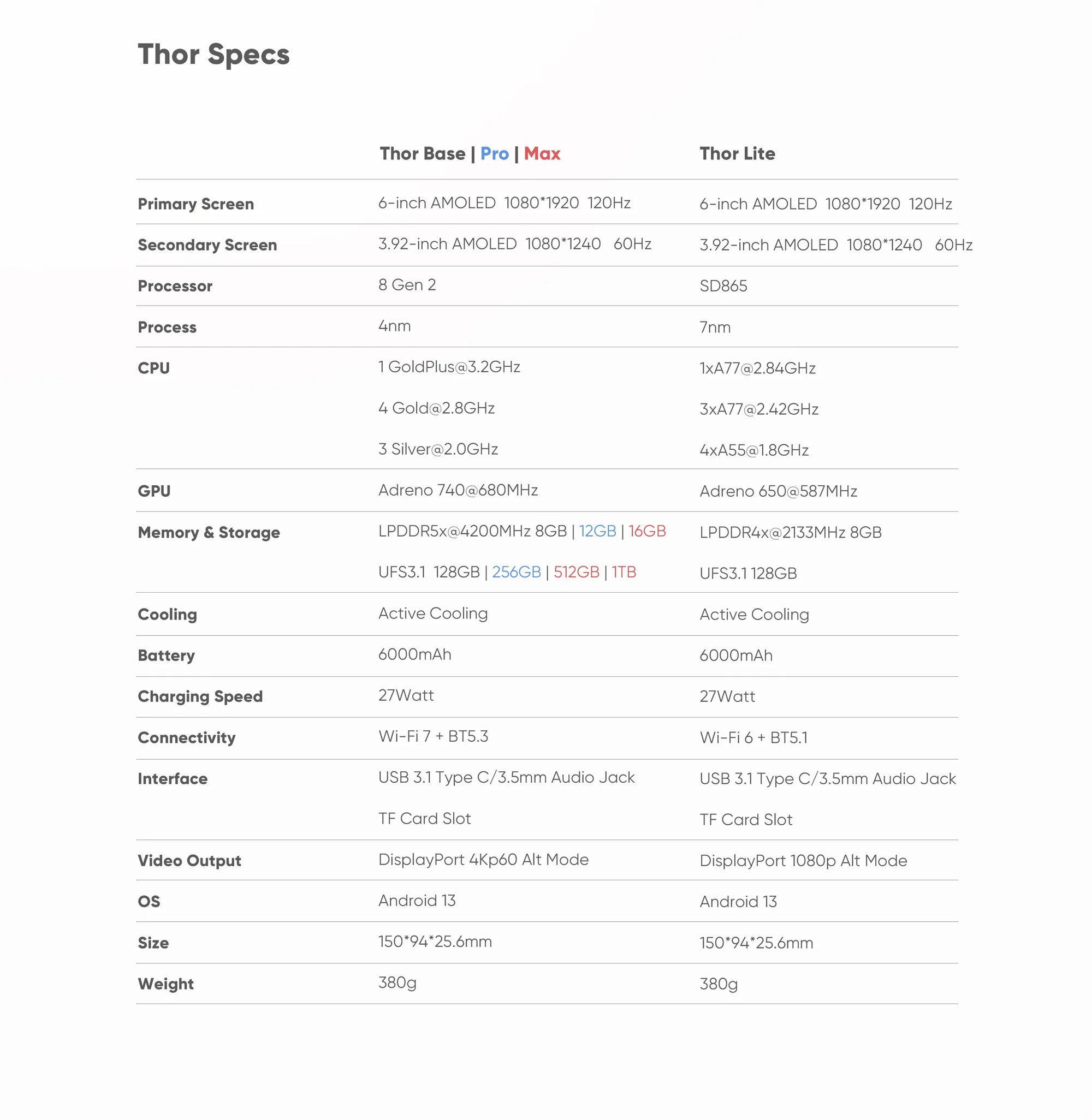 A tárolási típus változása befolyásolja a Snapdragon 8 Gen 2-thor meghajtású változatát érinti. Ide tartozik a Thor Base 8 GB RAM-mal és 128 GB tárhellyel, a Thor Pro 12 GB RAM-mal és 256 GB tárhellyel, valamint a Thor Max 16 GB RAM-mal és 512 GB tárhellyel. A Thor Lite, amely egy Snapdragon 865 processzorral már most is UFS 3.1-es tárolót használ, és ezután is így lesz.