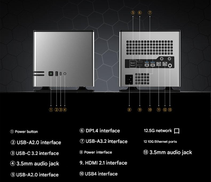 Amint az alábbi képen látható, az Abee AI Station számos porttal rendelkezik az elülső és hátsó panelen. A mini-PC emellett beépített 400 W-os tápegységet (PSU) is tartalmaz. Mindemellett az Abee állítása szerint az AI Station mindössze 199 x 199 x 199 mm-es. A teljesen alumíniumból készült burkolat azonban hozzájárul a készülék hivatalos 5,3 kg-os súlyához.