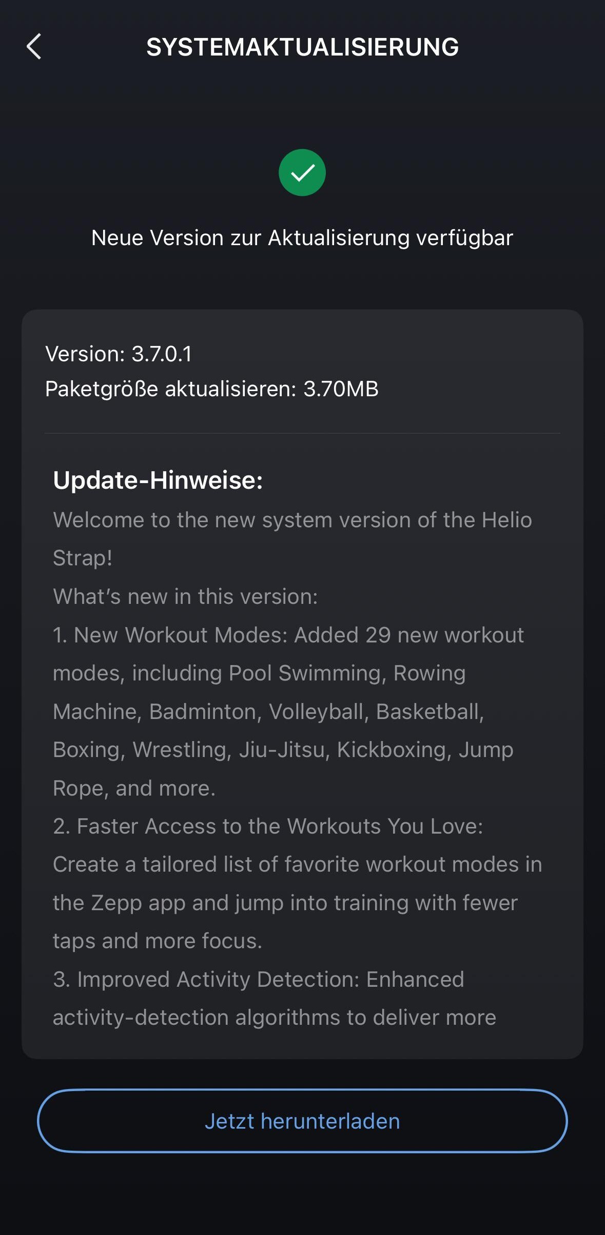 Ez a 3.7.0.1-es verzió a jelek szerint szakaszosan jelenik meg az Amazfit Helio Strap(jelenleg 99,00 $ az Amazonon) felhasználói számára. Néhány felhasználóhoz már eljutott, például az Egyesült Államokban és Németországban, bár hogy mikor lesz mindenki számára elérhető, az nem világos. A frissítés szokás szerint a Zepp okostelefonos alkalmazáson keresztül telepíthető.