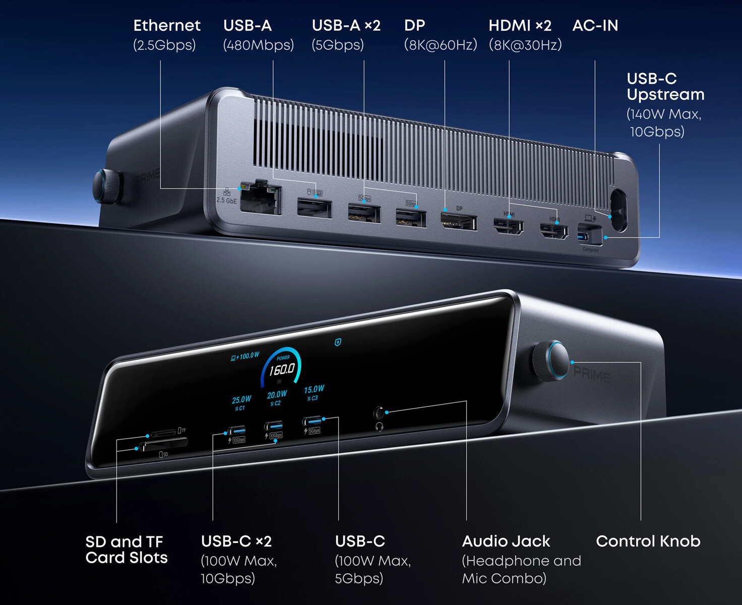 Van támogatás a alkalmazásvezérléshez, amely lehetővé teszi a felhasználók számára az összes csatlakoztatott eszköz felügyeletét, a kijelző casting beállításainak módosítását és a diagnosztika elvégzését. A Prime Docking Station 14-in-1 beépített intelligens kijelzővel is rendelkezik, amely valós idejű információkat mutat a portokról.