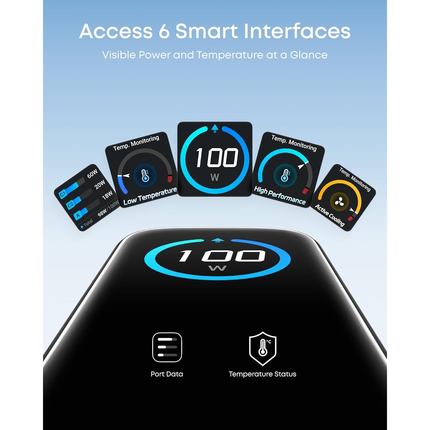 Egyetlen eszköz töltésekor bármelyik USB-C port képes a teljes 100 W-os teljesítményt leadni. Két eszköz csatlakoztatása esetén a teljesítmény 70W-ra és 30W-ra, 67W-ra és 33W-ra, illetve 95W-ra és 5W-ra oszlik meg, míg mindhárom port használatakor 80W-ra, 12W-ra és 7,5W-ra. A felhasználók minden esetben elegendő energiát kapnak egy laptop és más eszközök egyidejű feltöltéséhez. A töltő emellett tartalmaz egy automatikus alacsony fogyasztású üzemmódot, amely az USB-A kimenetet 5W-ra korlátozza az alacsony fogyasztású eszközök, például a fülhallgatók számára.