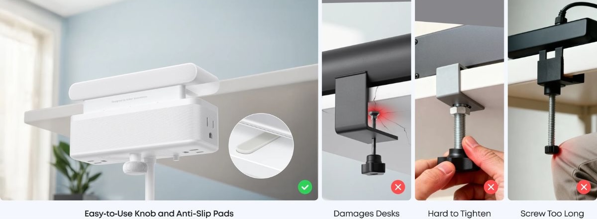 Az Anker Nano Power Strip állítható bilincses kialakítású, a két felét egy beépített gomb segítségével rögzíti az íróasztal felett és alatt. A vállalat szerint ez a rendszer biztonságosan a helyén tartja a készüléket, lehetővé téve a felhasználók számára, hogy egy kézzel csatlakoztassák vagy kihúzzák az eszközöket anélkül, hogy az elmozdulna. Úgy tervezték, hogy illeszkedjen a 0,6 és 1,8 hüvelyk (~12 és 45 mm) közötti vastagságú asztalokhoz, és ez a GaN töltő mérete 6,02 x 2,06 x 3,97 hüvelyk (153 x 52,2 x 100,85 mm).