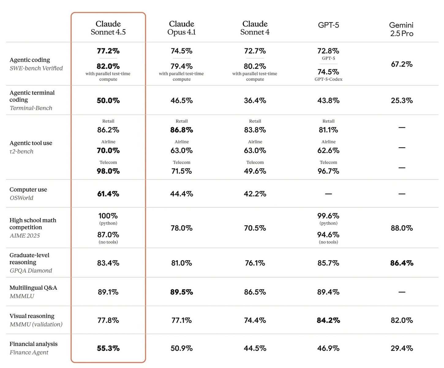 A Sonnet 4.5 jó teljesítményt nyújt több jelentős mesterséges intelligencia kódolási benchmarkon, köztük a SWE-bench-en és a Terminal-Bench. A mesterséges intelligencia javított képességgel rendelkezik a számítógépes eszközök önállóan történő használatára, amint az a vezető OSWorld benchmarkban is látható eredményét, lehetővé téve számára, hogy létrehozza a claude.ai weboldal működő klónját a oldalon létrehozását.