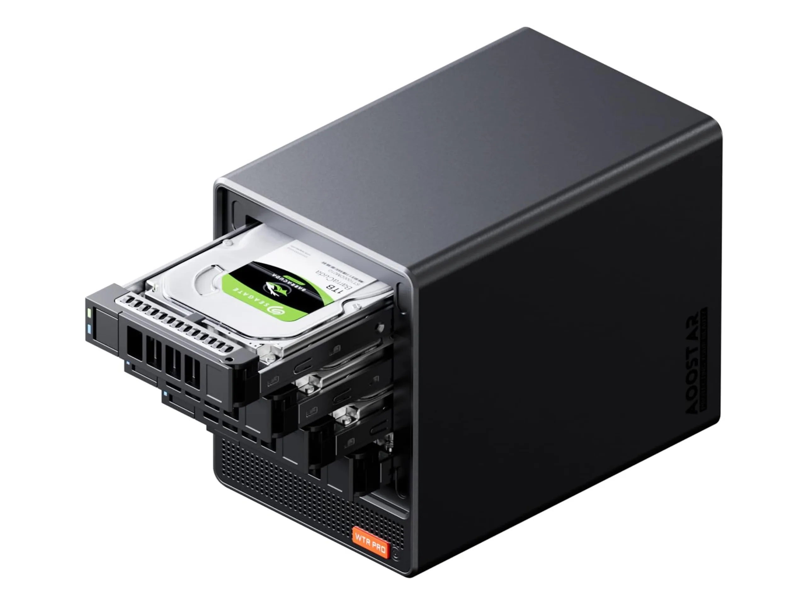A tárolóeszköz mérete 9 x 5,9 x 7,3 hüvelyk, és összesen öt tömegtároló eszköz befogadására alkalmas: egyetlen M.2 2280-as szilárdtest-meghajtó, valamint négy SATA HDD vagy SSD. A megfelelő foglalatokat 3,5 hüvelykes meghajtókkal lehet elfoglalni, ami azt jelenti, hogy a hagyományos pörgős merevlemezekre támaszkodva nagy mennyiségű adat tárolható.