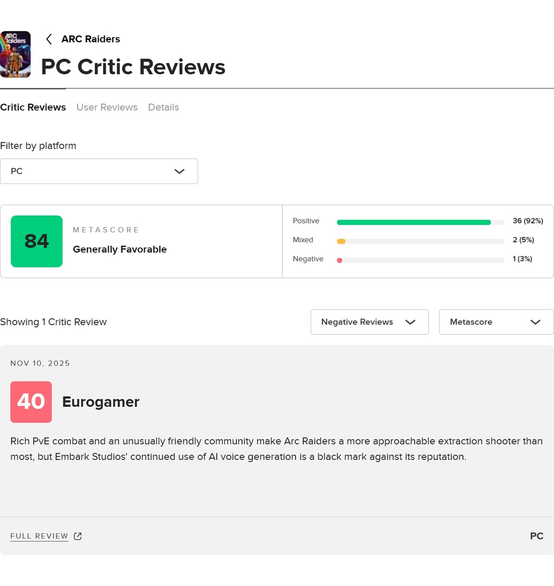 Az Embark Studios extraction shooter Arc Raiders felülmúlta a várakozásokat játékosok száma. A média véleménye is pozitív, a 84-es Metacritic értékeléssel. Azonban egy pontszám kilóg, mint egy fájó hüvelykujj, mint az egyetlen negatív Arc Raiders értékelés az aggregátoron. Eurogamer 2/5-ös értékelést adott a játéknak, elsősorban a a generatív mesterséges intelligencia használata miatt.