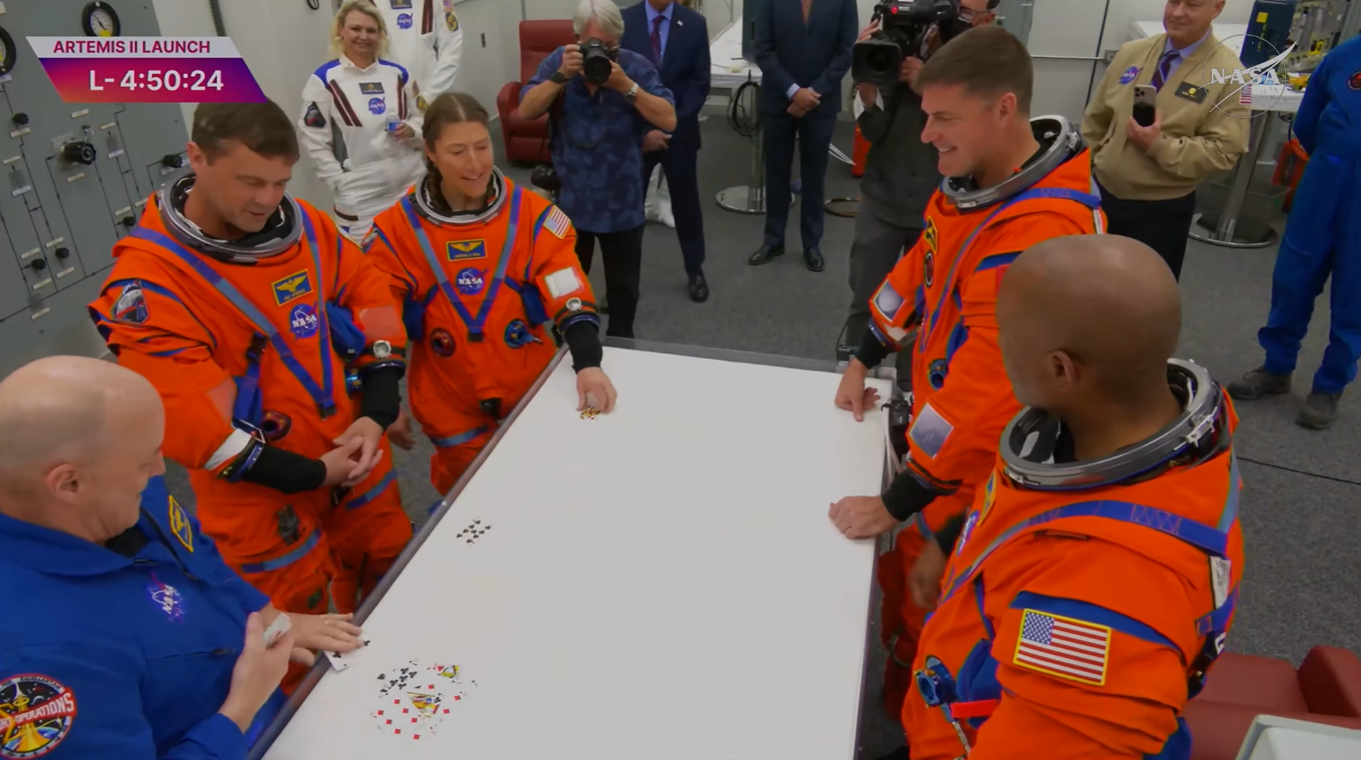 Mielőtt azonban elindultak volna az égbe, a legénység egy különös rituálét hajtott végre: egy régi hagyománynak megfelelően az űrhajósok addig kártyáztak, amíg a parancsnok vesztett. A játék célja, hogy "kimerítsék" a parancsnok balszerencséjét, és csak a szerencse maradjon magára a küldetésre.
