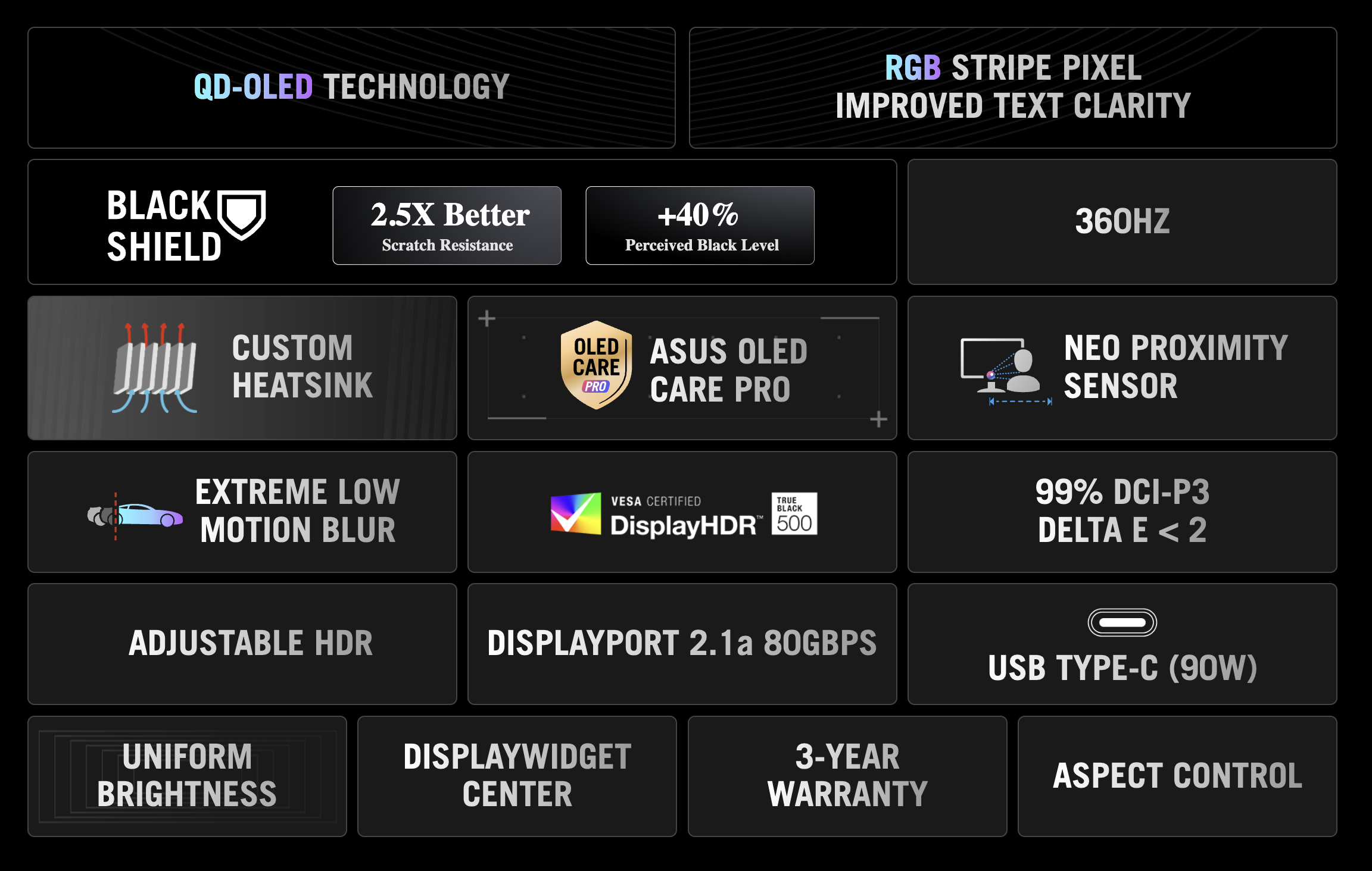 Ezzel szemben a ROG Swift OLED PG34WCDN a HP HyperX Omen OLED 34 hüvelykes modelljéhez csatlakozik, mint az egyik első olyan játékmonitor, amely a Samsung Display Gen 5 QD-OLED technológiáját használja. Ez az új panel egyrészt állítólag jobb szövegérthetőséget biztosít az RGB Stripe Pixel alpixel tömb révén. A gyakorlatban ez a változtatás a színrojtokat hivatott csökkenteni, ami továbbra is a meglévő QD-OLED és WOLED panelek egyik hiányossága. Másrészt az új QD-OLED panelnek SDR módban 500 nitet, HDR tartalmak megtekintésekor pedig kis területeken 1300 nitet kell elérnie.