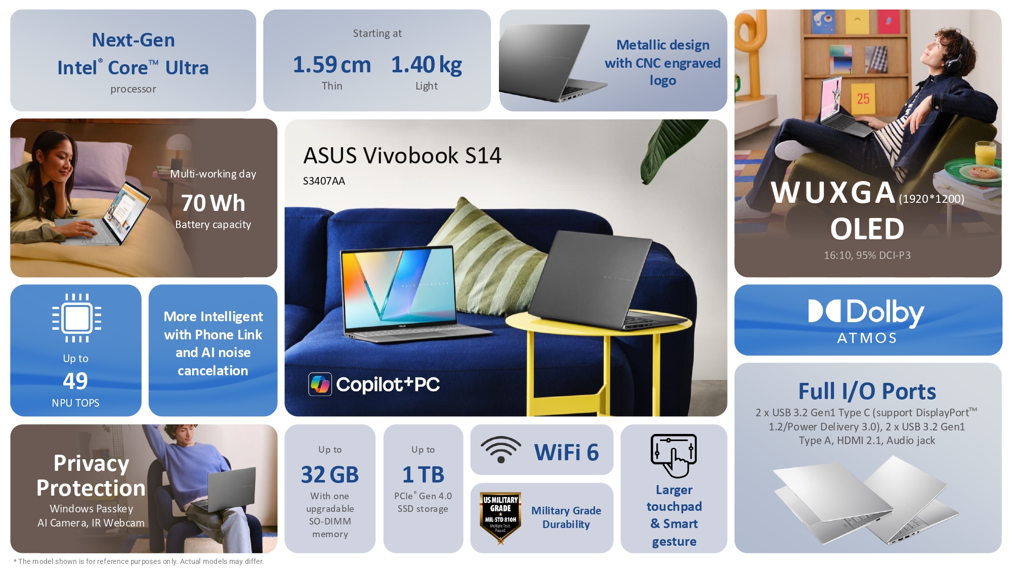 Mindkét modell ugyanolyan fémes kialakítással rendelkezik, CNC-gravírozott logóval. Méreteit tekintve mindhárom változat mindössze 1,59 cm (0,62 hüvelyk) vékony. Az AMD és a Snapdragon változatok azonban kissé nehezebbek, súlyuk 1,70 kg (3,74 font). Míg a Vivobook S14/S16 Intel változat mindössze 1,40 kg-ot nyom.