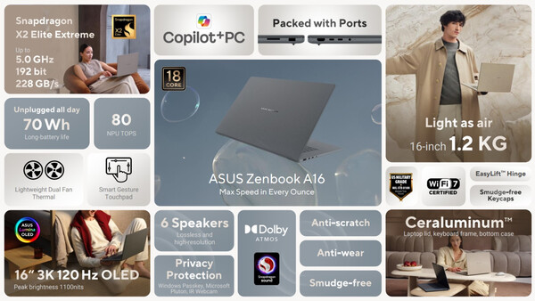 Miközben a hangsúly továbbra is a laptop amerikai megjelenésén van, az Asus csendben elkezdte a Zenbook A16 nemzetközi értékesítését is. Ausztráliában, az eurózónában és az Egyesült Királyságban például már megvásárolható a laptop. Jelenleg minden változatban megtalálható egy Snapdragon X2 Elite X2E-94-100 lapkakészlettel, 48 GB RAM-mal és 1 TB-os SSD-vel rendelkezik.