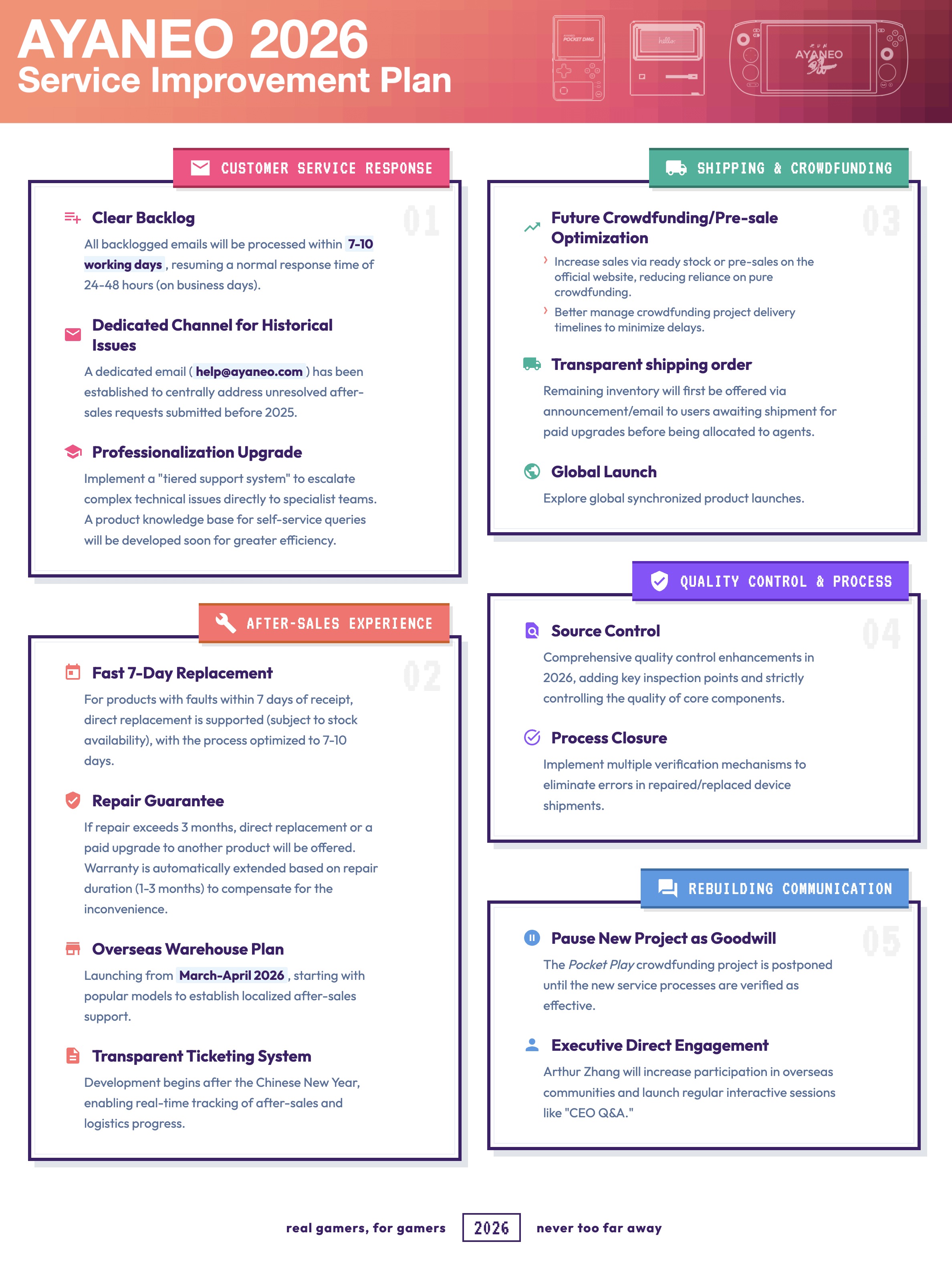 A közösségi médiacsatornáin közzétett, az Ayaneo 2026-os szolgáltatásfejlesztési terve öt fő területre terjed ki: ügyfélszolgálati válasz, értékesítés utáni tapasztalatok, szállítás és crowdfunding, minőségellenőrzés és folyamat, valamint a kommunikáció újjáépítése. Az alábbiakban a fejlesztési terv néhány kulcsfontosságú részletét mutatjuk be: