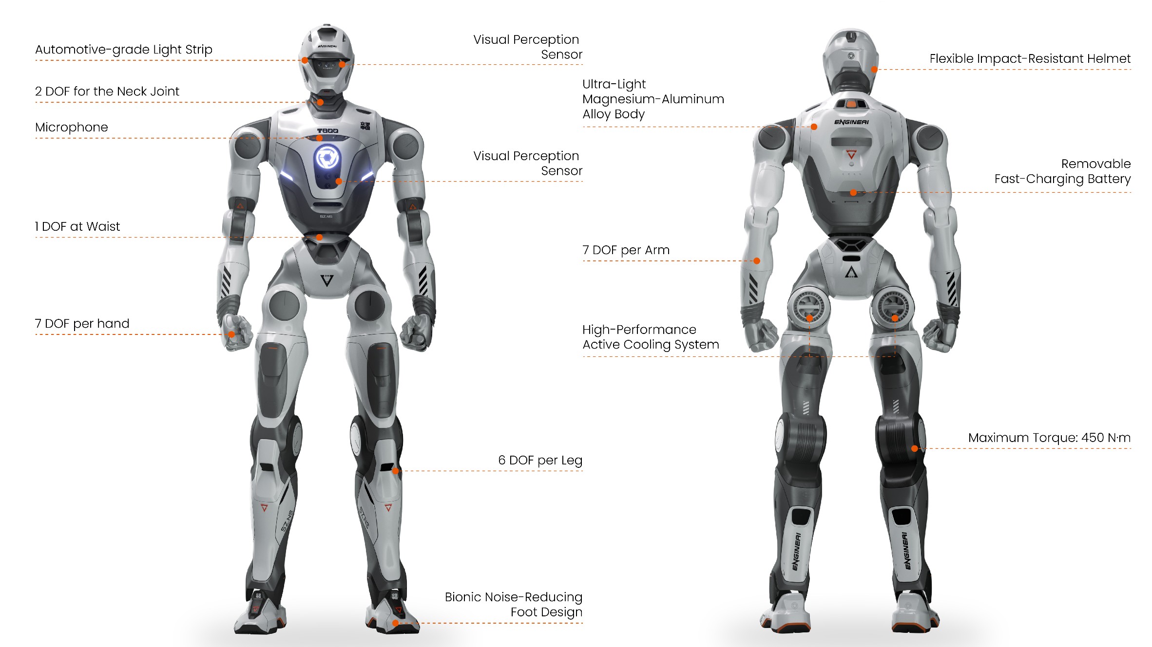 A T800-at 2025. december 2-án jelentették be, mint 1,73 méter magas (5 láb 8 hüvelyk) humanoid robotot, amely magnézium-alumínium ötvözetből készült testtel rendelkezik, és összesen 29 szabadságfokkal rendelkezik az összes fő ízületén, valamint 7 szabadságfokkal kezenként.