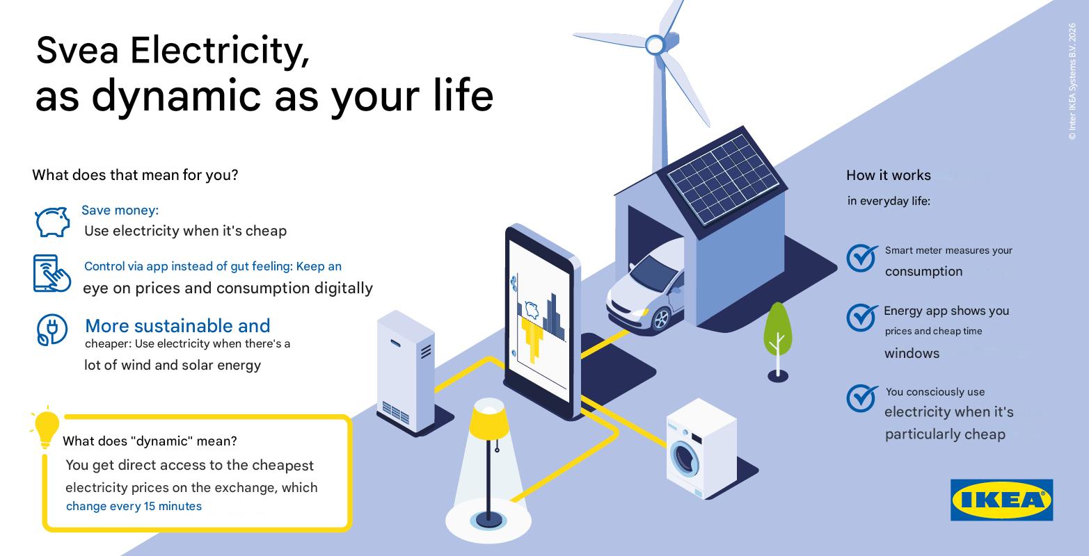 A Svea Strom révén az IKEA és a Svea Solar közvetlen hozzáférést biztosít az ügyfelek számára a nagykereskedelmi villamosenergia-árakhoz. Korábban ezek csak a nagyobb ügyfelek számára voltak elérhetőek. Ez több szempontból is előnyös lehet a Svea Strom ügyfeleinek. Először is, a fix havi díj helyett a felhasznált energia után kell fizetniük. Másodszor, a Svea Solar alkalmazáson keresztül a felhasználók nyomon követhetik a 15 percenként változó energiaárakat. Például olyan időszakban, amikor a hálózaton nagy mennyiségű nap- vagy szélenergia van, az árak jellemzően csökkennek. Ezeket az alacsonyabb árakat kihasználva csökkentheti energiaszámláját. Végül pedig a fotovoltaikus (PV) rendszerrel, hőszivattyúval, akkumulátortárolóval vagy elektromos járművel rendelkező ügyfelek automatikusan átállíthatják a villamosenergia-felhasználást az alacsonyabb díjszabású időszakokra.