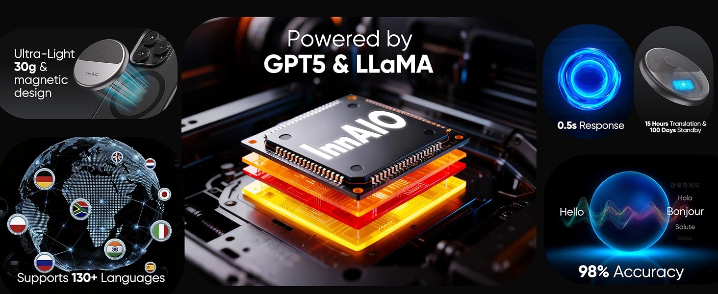 A vállalat szerint a fordítót a következő eszközök hajtják GPT-5 és az InnAIO nyelvi modelljét használja, és több mint 130 nyelvet támogat. A felhasználók a dialektusok között is válthatnak, és az InnAIO szerint a készülék 0,5 másodperces fordítási sebességgel és 98%-os pontossággal büszkélkedhet.