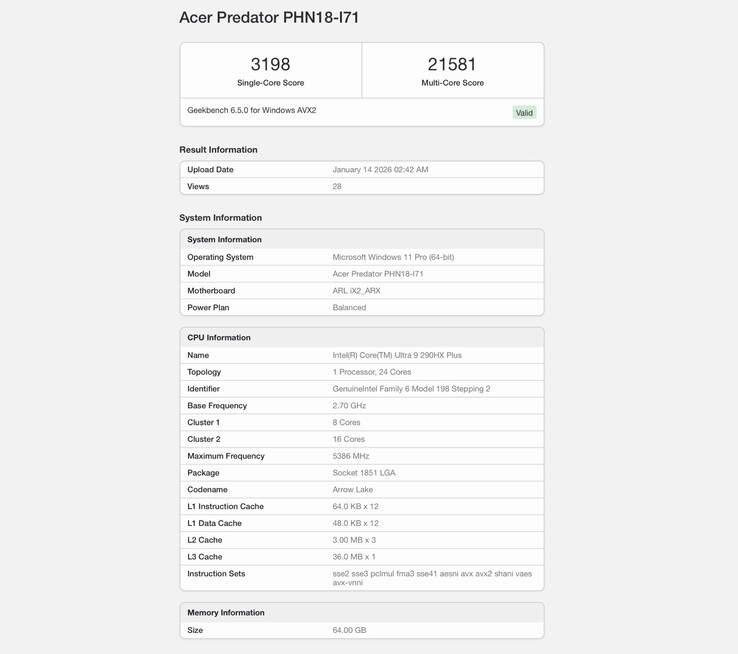 Geekbench most adott ízelítőt ebből a frissítésből, egy Intel Core Ultra 9 290HX Plusszal ellátott Acer Predator PHN18-I71-en végzett benchmarkfuttatást. Az eredmények szerint a chip nyolc teljesítmény- és 16 hatékonysági maggal rendelkezik, akárcsak a Core Ultra 9 285HX, de a processzor várhatóan valamivel magasabb órajeleket ér el. A Geekbench alig 5,4 GHz alatti boost órajelet mutat, ami 100 MHz-cel alacsonyabb lenne a régebbi zászlóshajó lapkánál, de a gyakorlatban az órajelek valószínűleg nagyban függnek attól, hogy az adott laptop mekkora teljesítményt tud biztosítani a processzornak.