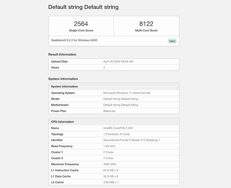 Az első Intel Core 5 320-as processzorral szerelt noteszgépek már megtörtént a Geekbench benchmarkja. Az egyszálas 2 564 pontos és a többmagos eredmény 8 122 pont, a chip majdnem kétszer olyan gyors, mint az AMD olcsóbb modellje Ryzen 5 7520U, de 11,1 százalékkal lassabb, mint a Apple MacBook Neo(589 dollár az Amazonon). A Intel Core Ultra 5 325 36 százalékkal erősebb