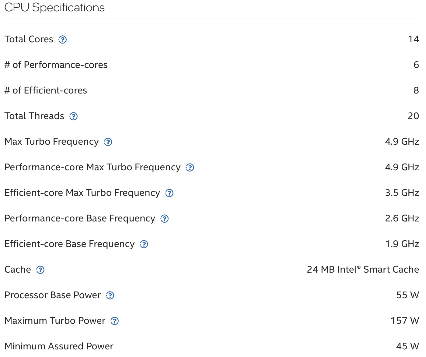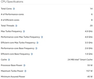 Az elrendezés pontosan ugyanaz, 14 magos elrendezéssel, amely hat nagy teljesítményű és nyolc nagy hatékonyságú magból áll. A maximális P-magok órajelét is változatlanul hagyták, a maximális turbófrekvencia 4,9 GHz. Az E-magok boost órajelét 100 MHz-cel csökkentették, így a maximális órajel most 3,5 GHz-en van. A CPU 24 MB intelligens gyorsítótárral, valamint 157 wattos csúcs TDP-vel marad.