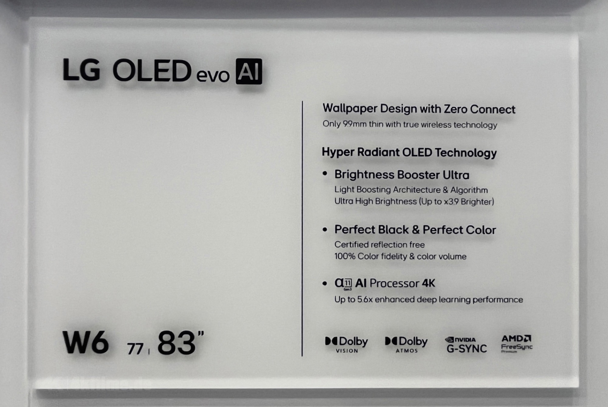 Az LG OLED W6 valószínűleg a G6-tal szinte teljesen megegyező kialakítású lesz, de egy lényeges különbséggel, nevezetesen a HDMI és USB portok a Zero Connect Boxon lesznek elhelyezve, nem pedig közvetlenül a tévén. Ez a doboz vezeték nélkül csatlakozik a televízióhoz, és megkönnyíti a kábelek elrejtését az olyan eszközökhöz, mint például a PlayStation 5. Az LG OLED TV-nek csak egy kis tápkábelre van szüksége. A W6 a jelek szerint 77 és 83 hüvelykes méretváltozatban kerül majd piacra.