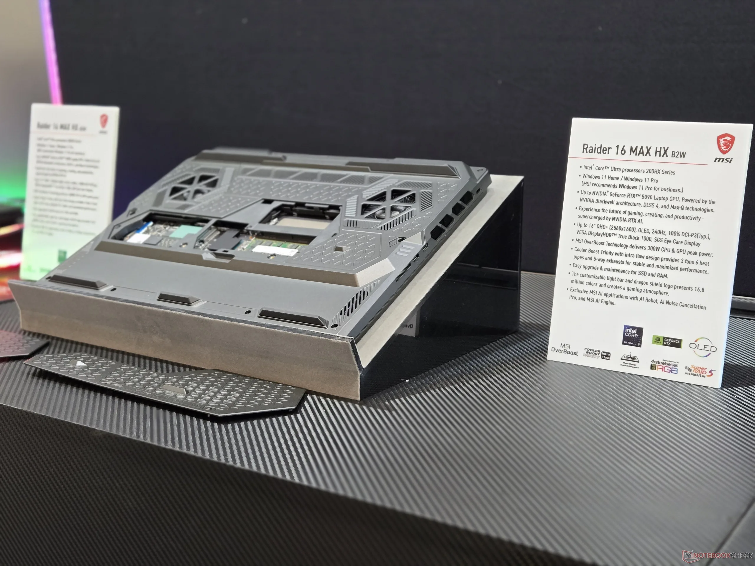 Alig néhány hete mutatták be a CES 2026-on, az új Raider 16 HX Max a 2025-ös modellhez hasonlóan az Intel Arrow Lake-HX CPU-kon és az Nvidia Blackwell hardveren fog futni. Az alváz mindazonáltal idén újratervezésre került, az alsó panelen egy új nyílással, amely megkönnyíti a frissíthető alkatrészekhez való hozzáférést, ahogyan azt az alábbi képek is mutatják. Ebben az esetben a tulajdonosok akár két DDR5 SODIMM modult és két M.2 PCIe5 SSD-t is beszerelhetnek anélkül, hogy a teljes alsó panelt fel kellene nyitniuk.