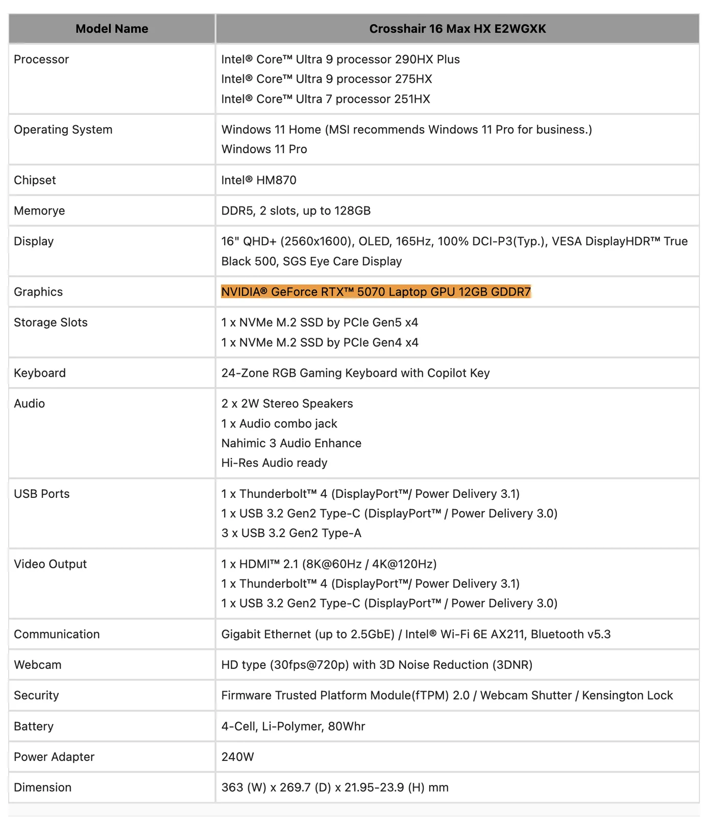A mai bejelentés tartalmaz egy olyan GPU-ra való utalást is, amelyet az Nvidia hivatalosan még nem fedett fel. Az MSI ugyanis megemlíti, hogy a Crosshair 16 Max HX E2WGXK kizárólag az "Nvidia GeForce RTX 5070 Laptop GPU 12GB GDDR7 12GB" névre hallgató Nvidia RTX 5070 Laptop GPU-val lesz elérhető.
