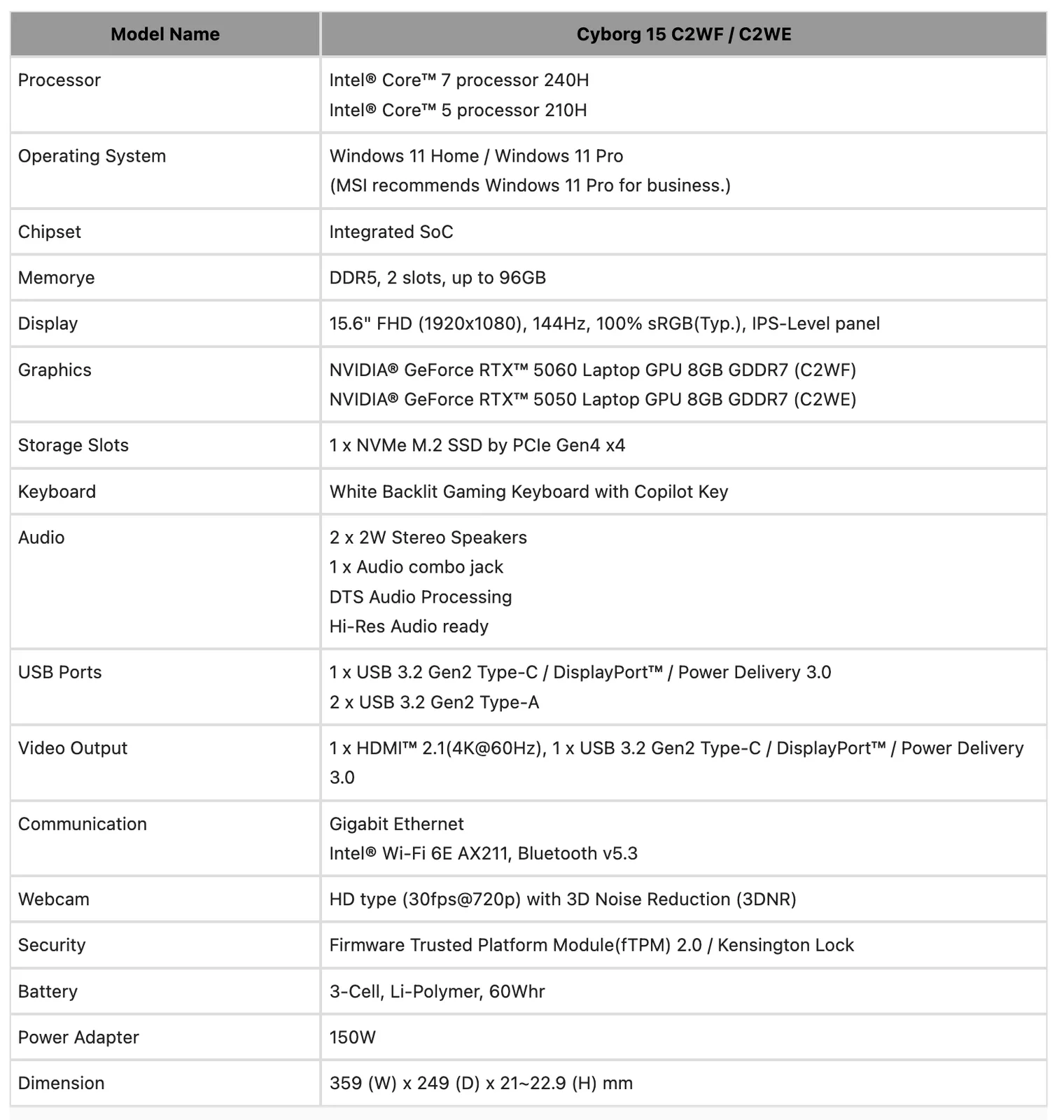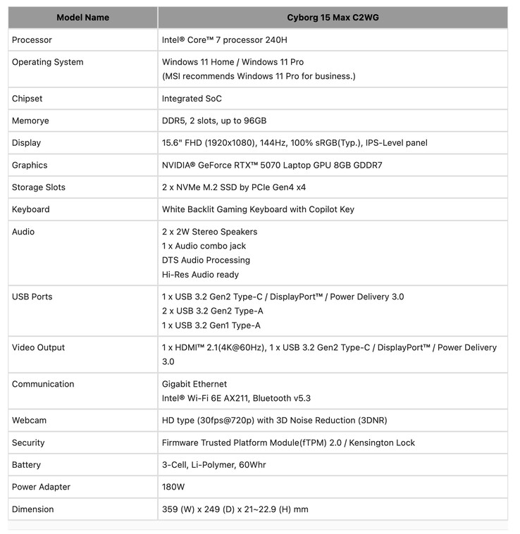 Ugyanakkor az MSI frissítette a Crosshair 16 HX-et az E14WGK, E14WFK és E14WEK változatokkal, kihasználva a Core i7 14650HX vagy Core i9-14900HX és a 8 GB-os változatok a GeForce RTX 5050, GeForce RTX 5060 vagy GeForce RTX 5070. Ezen kívül az MSI három új 15 hüvelykes Cyborg laptopot is bemutatott Cyborg 15 Max, C2WG Cyborg 15 C2WF és Cyborg 15 C2WE néven, a tavalyi modellekhez hasonló specifikációkkal (curr. 1299 dollár az Amazonon). Az MSI azonban még nem erősítette meg az új modellek árazását és elérhetőségét. A vállalat sajtóközleménye a címen olvasható további részletekért.