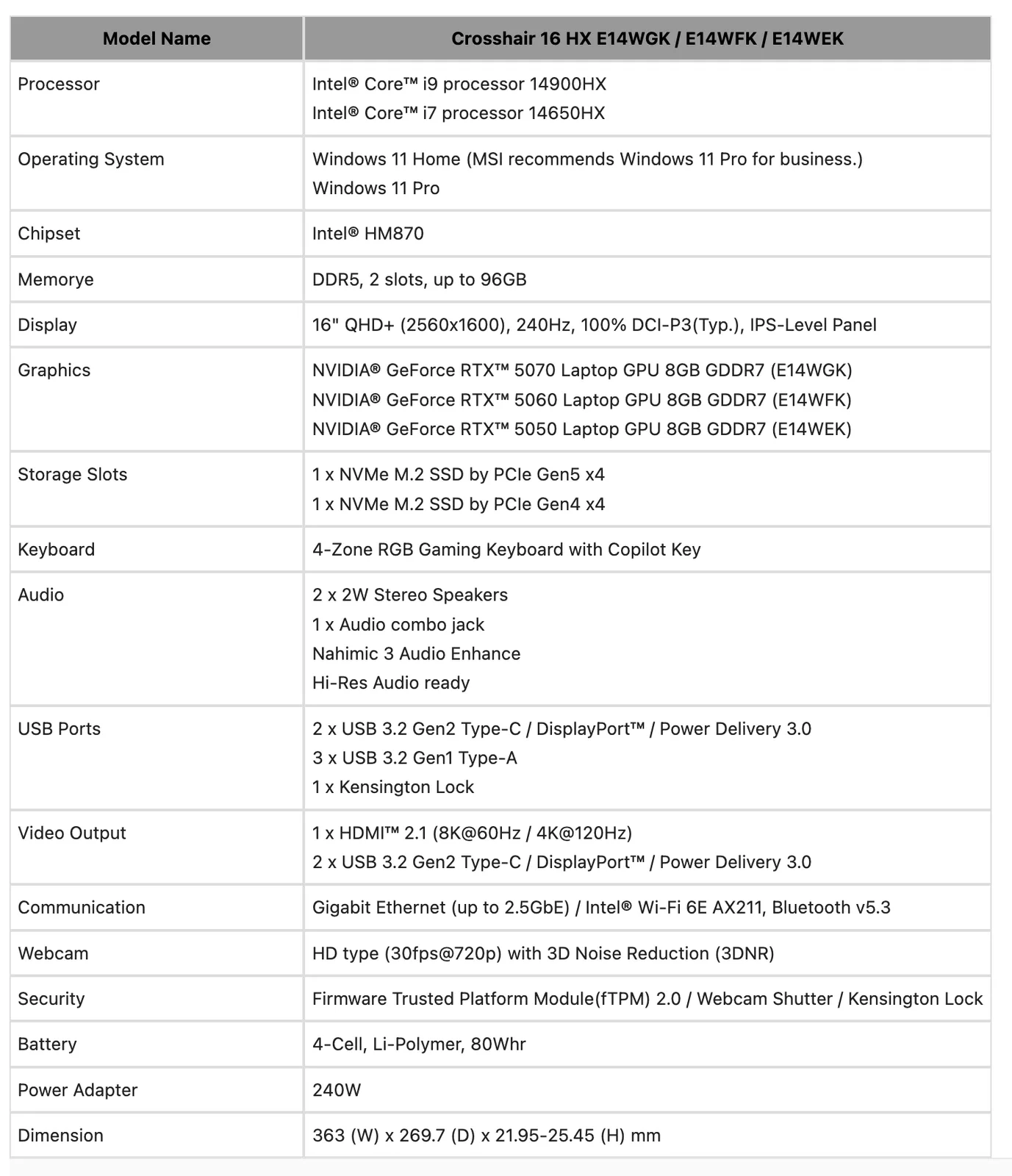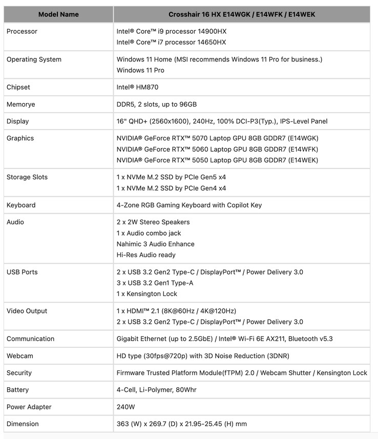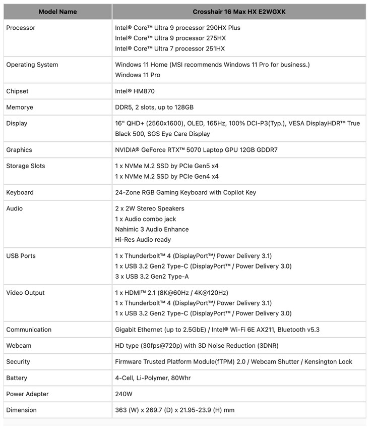 A Crosshair 16 Max HX E2WGXK egyébként az első olyan laptop, amelyről megerősítették, hogy az Nvidia 12 GB-os RTX 5070-es, még ki nem adott laptopjával GPU. Eközben a fent felsorolt másik hét laptop vagy az alábbi eszközökkel rendelkezik GeForce RTX 5070 Ti, GeForce RTX 5080 vagy a GeForce RTX 5090.