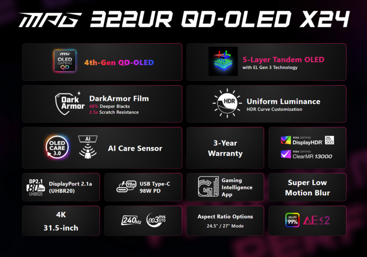 A panel szempontjából az "X24" modell a következőkkel van felszerelve 4. generációs tandem QD-OLED panellel van felszerelve (valószínűleg az LG gyártmánya), amely a EL Gen 3 technológiára épül. Ez az 5 rétegű felállás azt állítja, hogy 30%-kal növeli a fényhatékonyságot, miközben csökkenti az energiafogyasztást. A védelemről a "DarkArmor" fólia gondoskodik - az MSI állítása szerint 2,5-szeresére növeli a karcállóságot és 40%-kal mélyíti a feketéket -, valamint egy NPU-alapú AI Care Sensor, amely a képernyőt sötétíti, ha nem érzékeli az emberi jelenlétet, hogy megakadályozza a beégést. A pixelvédelmet "valós idejű környezeti tudatosság" alapján automatizálja.