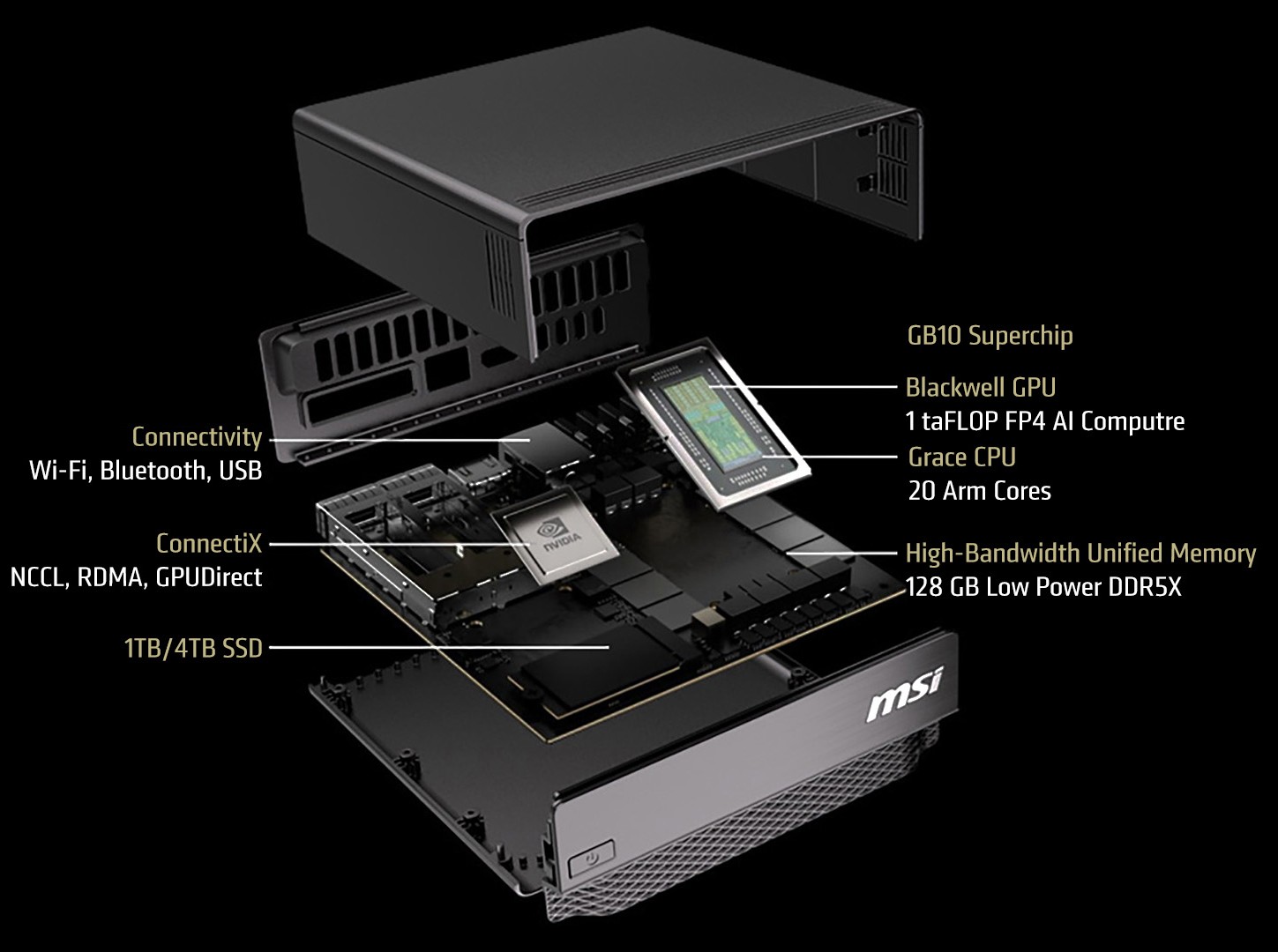 A 99SUS 1 TB specifikációja lényegében megegyezik az eredeti MS-C931-ével, kivéve, hogy a Bluetooth verzió 5.4-ről 5.3-ra csökkent. Egyébként a tápellátás a GB10 szuperchip, amely egy Blackwell GPU-val rendelkezik, amely 1 PetaFLOP FP4 AI utasítás feldolgozására képes, valamint egy Grace CPU 10 ARM Cortex-X925 maggal és 10 ARM Cortex-A725 maggal. A szuperchipet 128 GB LPDDR5X egységesített rendszermemória egészíti ki 273 GB/s sávszélességgel. A CPU és a GPU egyaránt hozzáférhet az LPDDR5X RAM-állományhoz egy NVLink C2C összeköttetésen keresztül, amely 5x PCIe 5.0 sávszélességet kínál. Ami a tárolást illeti, az MSI 1 vagy 4 TB-os NVMe SSD-választékot kínál. A ház mérete 151 x 151 x 52 mm (1,19 l térfogat), súlya pedig 1,2 kg.