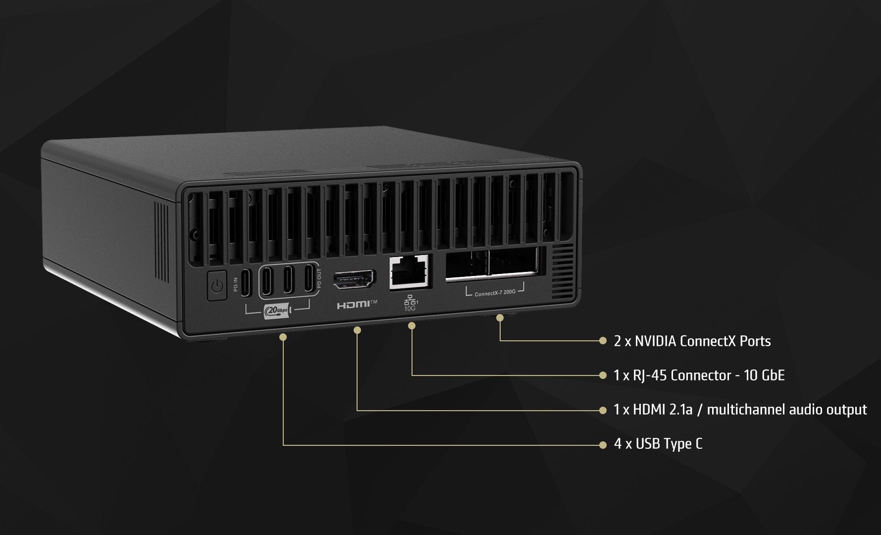 A portválasztékban 4X USB-C 3.2 20 Gbps-os port PD-funkcióval, HDMI 2.1a videokimenet többcsatornás hangkimenettel, egy 10 GbE NIC és 2x Nvidia ConnectX-7 található. A vezeték nélküli csatlakozást egy Wi-Fi 7 + BT 5.3 kártya révén.