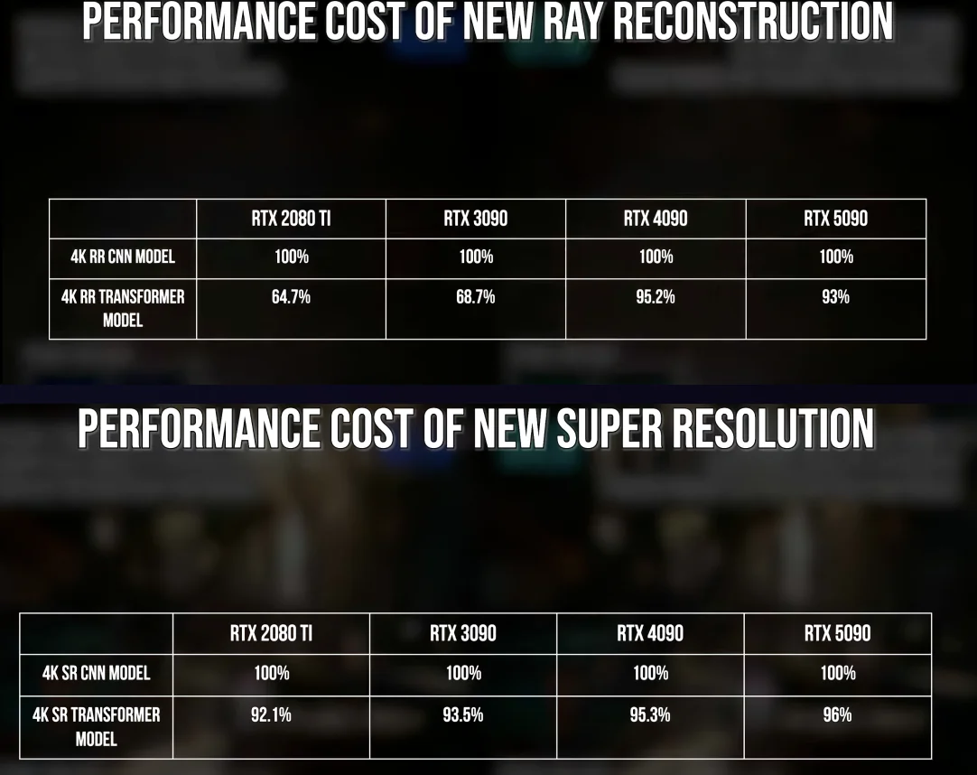 A DLSS 4 Transformerje némi teljesítménytöbblettel jár. Amint azt a Digital Foundry a DLSS 4 mélyebb merülésében megjegyeztea Turing RTX 20-as és az Ampere RTX 30-as sorozatú kártyák nagy hátrányt szenvednek a Transformerrel, mivel a Tensor magok natívan csak az FP16-os következtetést támogatják.