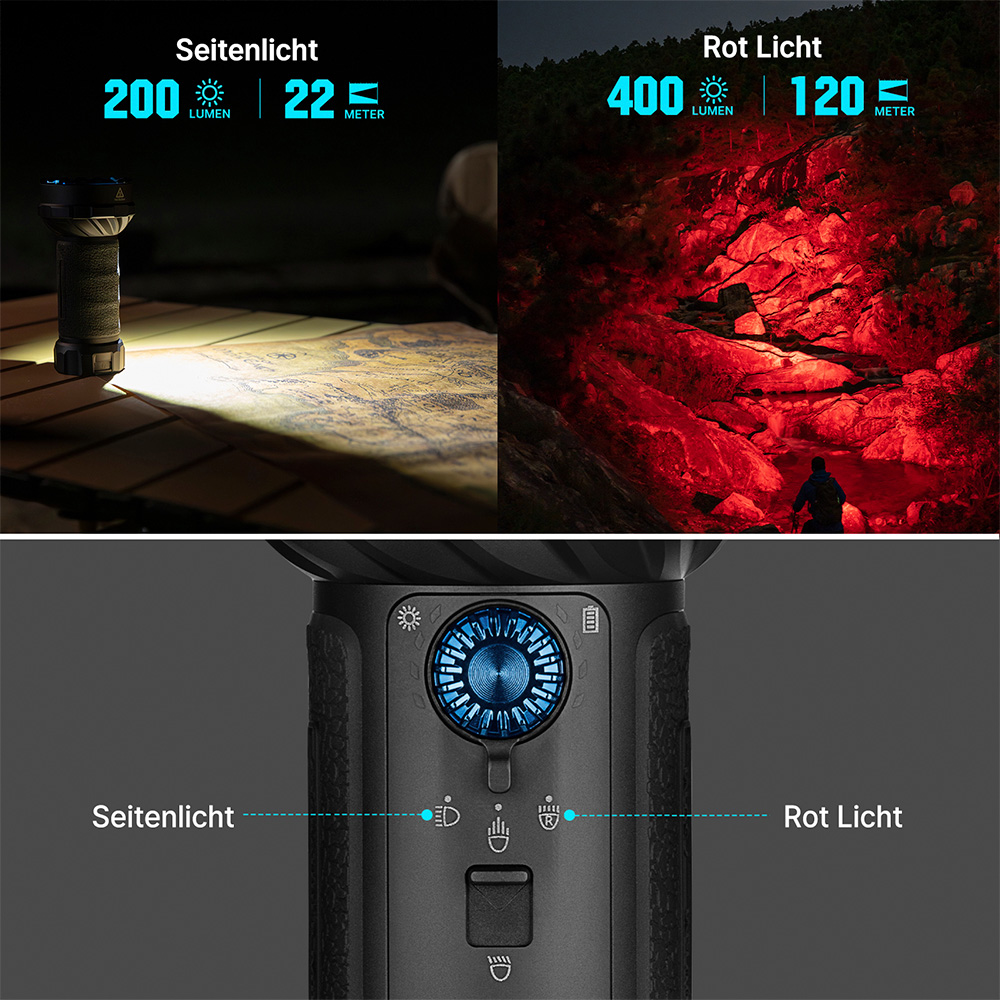 A zseblámpa több kezelőszervvel rendelkezik, beleértve egy forgótárcsát, egy választókapcsolót a tárcsán, amely oldalra csúszik, és egy csúszókapcsolót, amely a reflektorfényt, a reflektort és a kombinált üzemmódot vezérli. Ez utóbbi nem működik, ha a piros fény vagy az oldalsó fény be van kapcsolva. A forgótárcsa a bekapcsológombként is funkcionál.