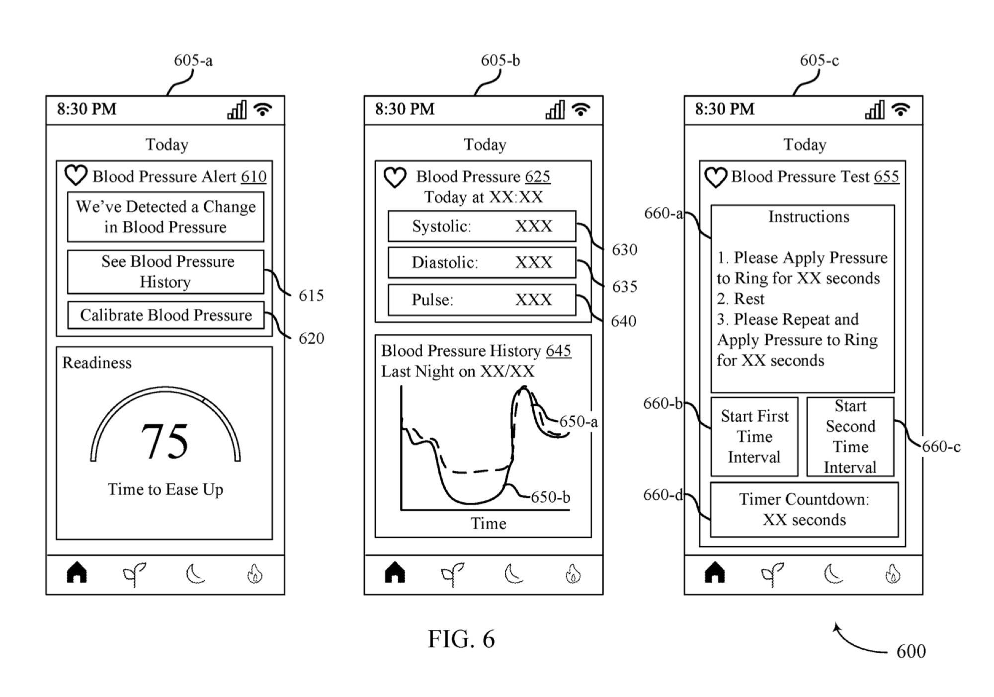 A szabadalom lényegében a test két pontja közötti pulzushullámok időtartamának mérésére szolgáló módszert ír le. Ez azért lényeges, mert a vérnyomást a pulzushullámnak a test egyik pontjából a másikba való eljutásához szükséges idő alapján határozzák meg. Az így meghatározott pulzus időintervallum lehetővé teszi az Oura számára a vérnyomás kiszámítását. Amint a szabadalmi rajzok mutatják, a szisztolés és diasztolés vérnyomás konkrét értékei jelennek meg, nem pedig csak egy durva trendvonal, mint néhány konkurens termék esetében.