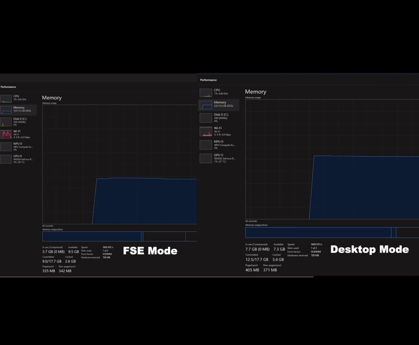 Az FSE egyik figyelemre méltó tulajdonsága, hogy képes felfüggeszteni a szabványos Windows asztali környezetet, csökkentve ezzel a háttérfolyamatokat és az általános memóriahasználatot. A YouTuber által bemutatott tesztek során egy játékra használt laptop, amely egy Nvidia GeForce RTX 5050 körülbelül 5,7 GB RAM-ot használt az FSE-ben, szemben a 7,7 GB-os normál asztali üzemmódban használt memóriával Microsoft állítása szerint nagyjából 2 GB-ot takarít meg. Ez a csökkentés jelentősen előnyös lehet a korlátozott memóriával rendelkező rendszerek vagy a megosztott RAM-ra támaszkodó integrált grafikus konfigurációk számára.