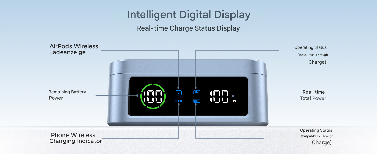 A 20 000 mAh névleges kapacitású hordozható töltő állítólag 3,7-szer képes feltölteni az iPhone 17-et, 1,2-szer a MacBook Airt és 1,7-szer az iPad Pro 11"-et. Támogatja a következőket 65 W-os gyorstöltés, így a belső akkumulátor gyorsan 0%-ról 100%-ra gyorsulhat.