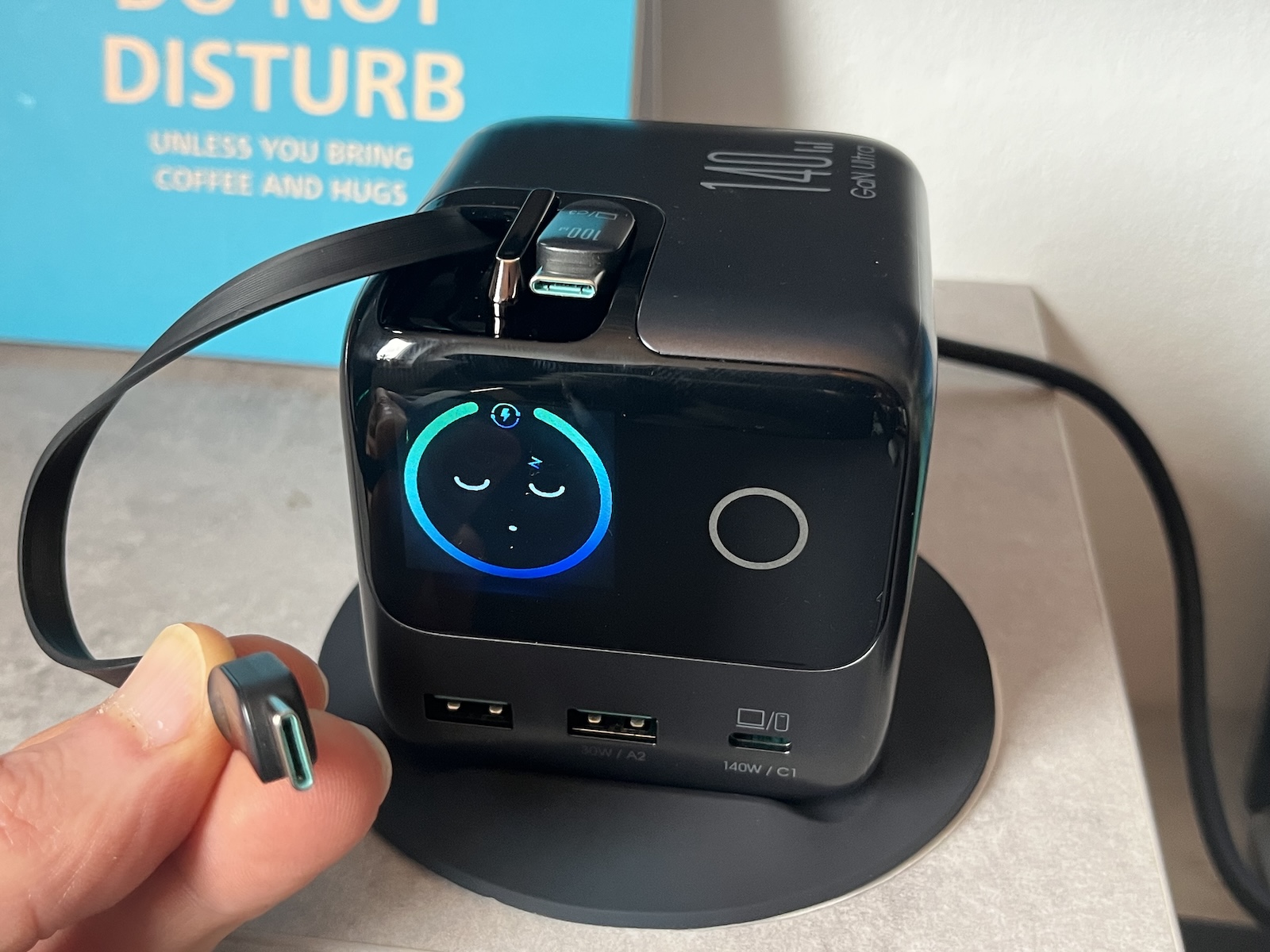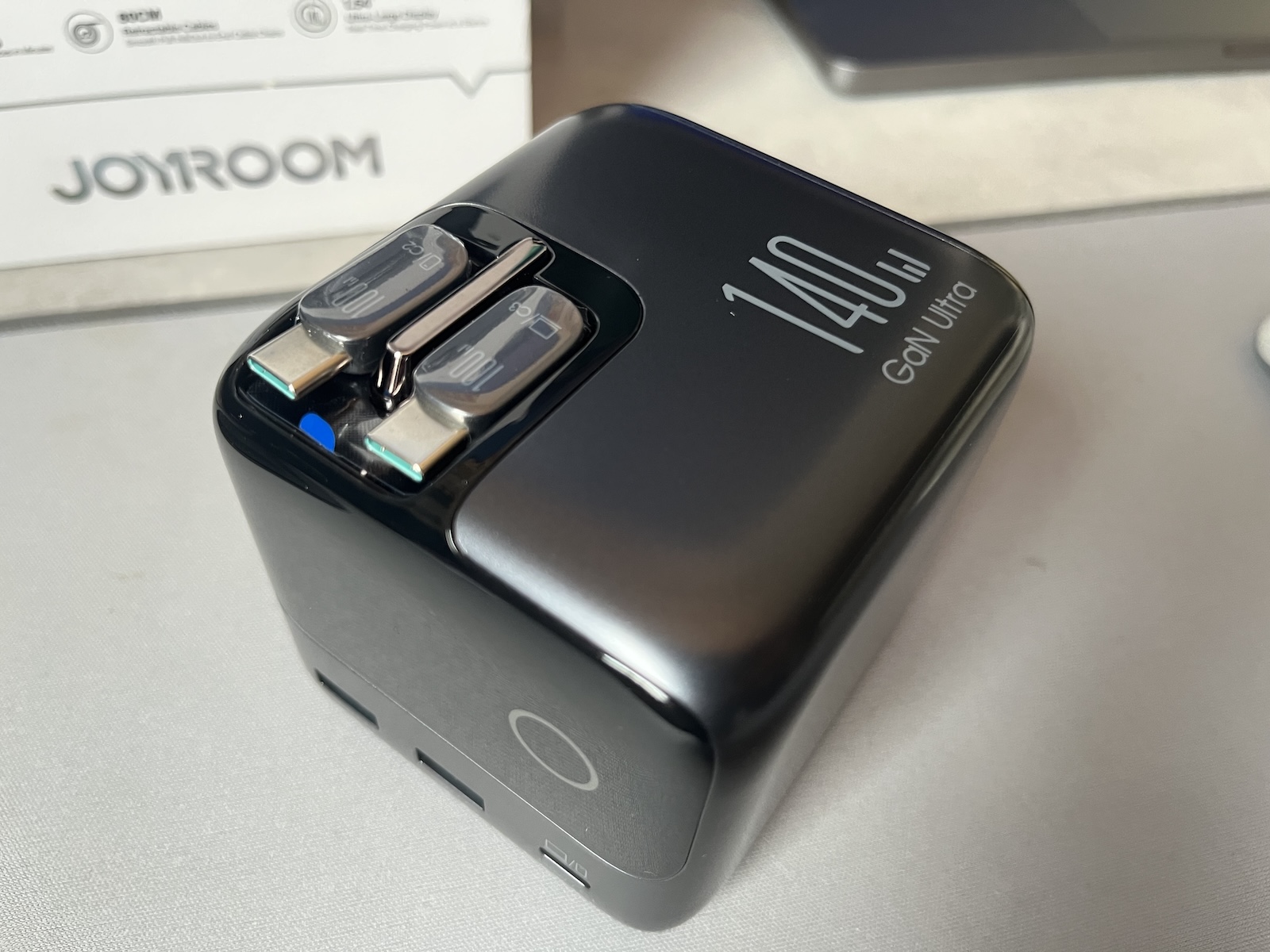 A Joyroom Podix 140W-os töltő számos portot kínál, ezért több külön töltő és kábel helyettesíthető vele. Az akár 140 wattos teljesítmény könnyen elegendő ahhoz, hogy akár laptopokat (irodai használatban) is elegendő energiával lásson el, és egyszerre töltsön fel különböző kisebb kütyüket. A portok kiosztásánál óvatosan kell eljárni, mivel több port használata esetén az egyes portok kimeneti teljesítménye erősen korlátozott. A csúcspont a két Type-C kábel, amelyek feltekerve tárolhatók a készülékben, és szükség esetén mintegy 75 centiméteresre hosszabbíthatók. Ez azt jelenti, hogy a szanaszét heverő mobiltelefon-töltőkábelek végre a múlté.