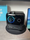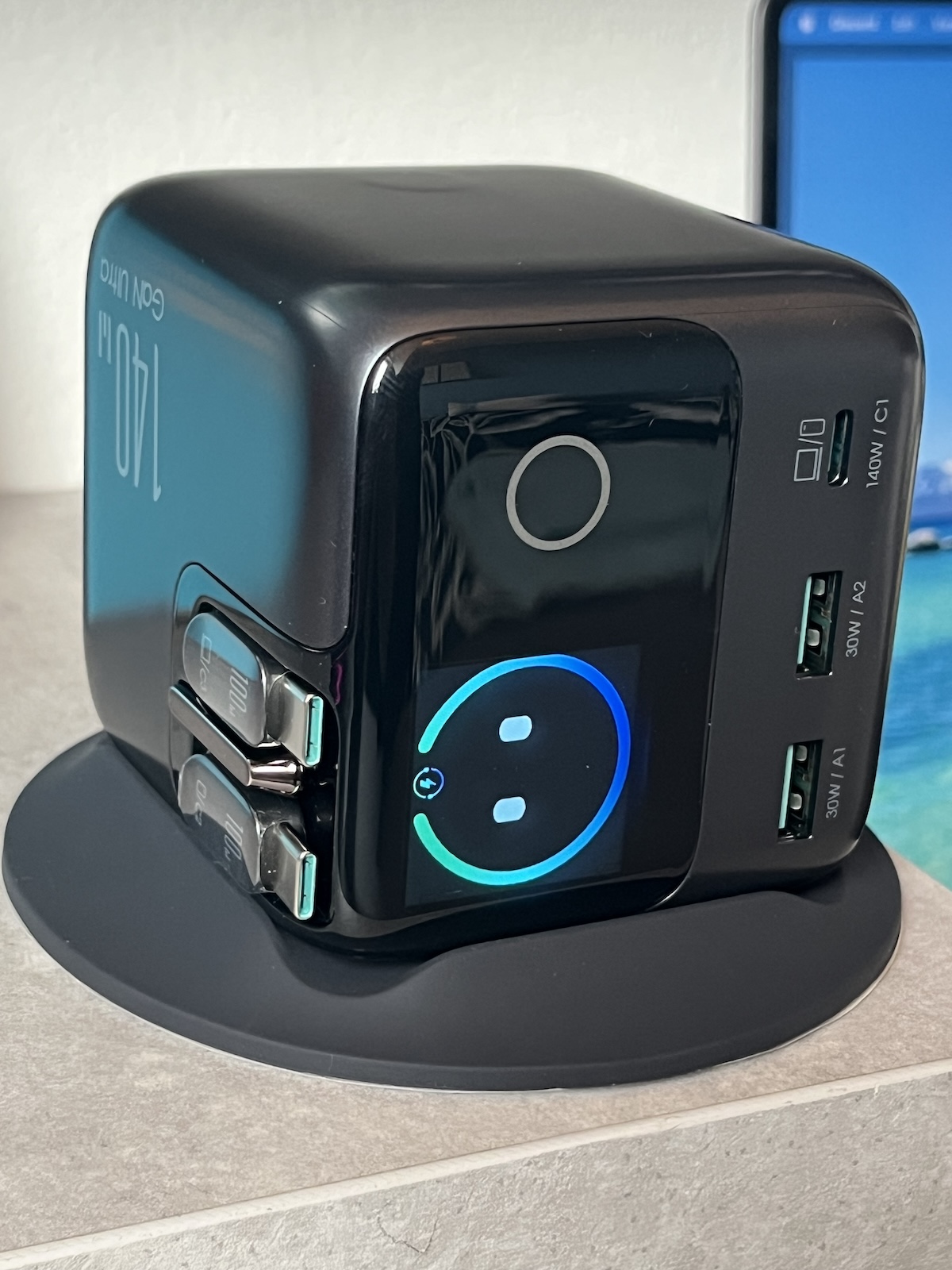 A Joyroom Podix 140W-os töltő eredetileg egy crowdfunding projektből származik. Nem mobil tápegységnek tervezték, hanem inkább egy univerzális töltőállomásnak az otthoni és irodai használatra. Mérlegünk 464 grammot mutat, ami egyértelműen túl sok ahhoz, hogy rendszeresen magunkkal vigyük. A helyhez kötött használatot hangsúlyozza a mellékelt gumiállvány, amelynek alján ragadós (és mosható) szilikonbevonat található. Magát a töltőt mágnesesen tartja a helyén. Az állvány elvileg elhagyható, de akkor az önzáró Type-C kábelek használatakor a másik kezünkkel kell a helyén tartani. Erről később bővebben. Lehetőség van az oldalsó felületre való billentésre is; a kijelző háromszori megérintésével beállítható a tájolása.