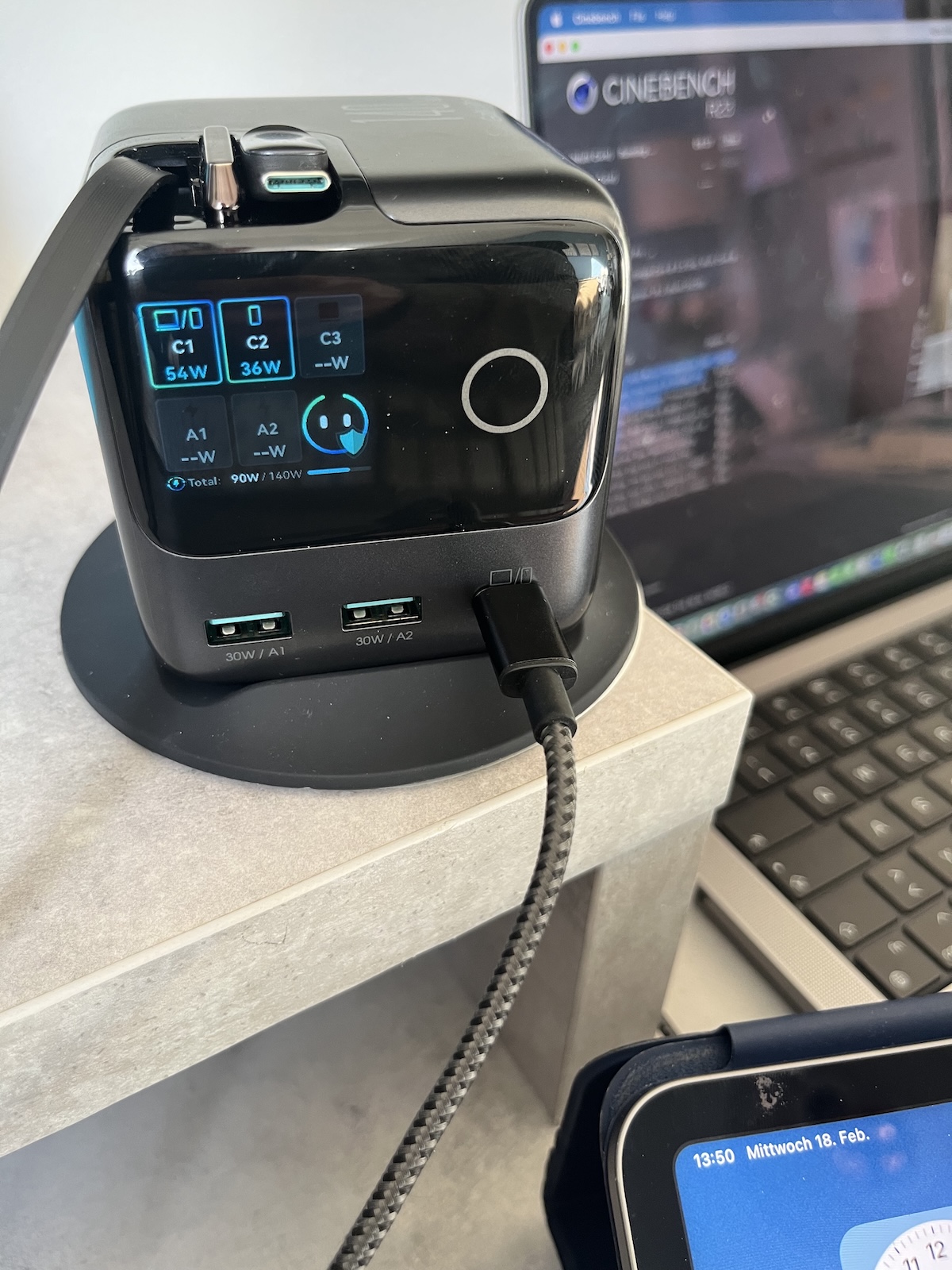 Elméletileg tehát lehetséges, hogy csak egy különösen energiaigényes eszköz, például egy laptop a C1 porton, használja a rendelkezésre álló energia nagy részét, és a többi portot ennek megfelelően korlátozzák. Valószínűbb azonban az a probléma, hogy ha egyszerre több porthoz is csatlakoznak eszközök, akkor azok automatikusan csökkentik a maximális teljesítményt, függetlenül a ténylegesen felhasznált teljesítménytől. Itt például a tesztben egyetlen csatlakoztatott adapter, egy Type-C-ről Lightning adapterre csatlakoztatott adapter is elég lehet ahhoz, hogy jelentősen csökkentse a többi porton leadott teljesítményt. Ebben az esetben fontos, hogy a táplálandó eszközöket az optimális portra csatlakoztassuk. A legnagyobb energiafogyasztású eszközt a C3-as portra (a két hosszabbítható kábel közül a jobb oldalira) kell csatlakoztatni, mivel ez a port biztosítja a lehető legnagyobb teljesítményt több csatlakozással. Ha csak egy eszköz van csatlakoztatva, akkor ez a C1 Type-C aljzat lesz.