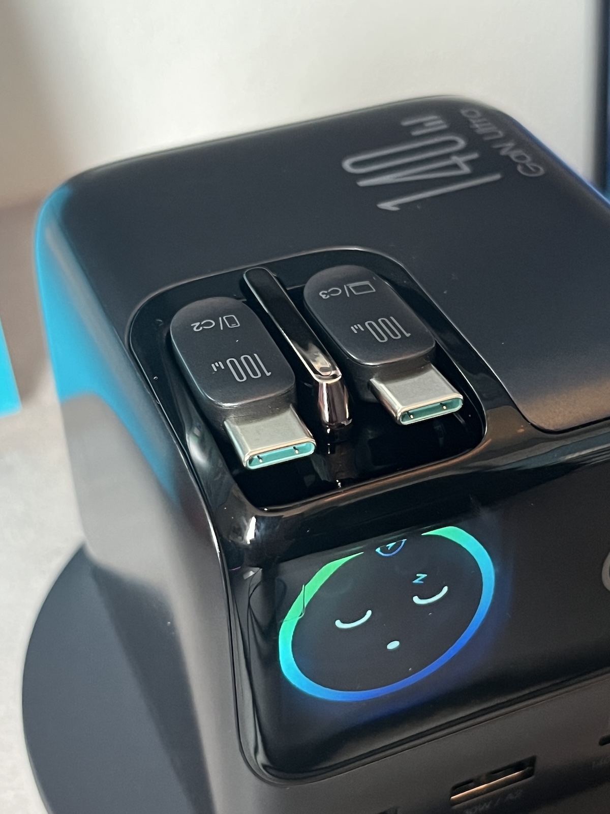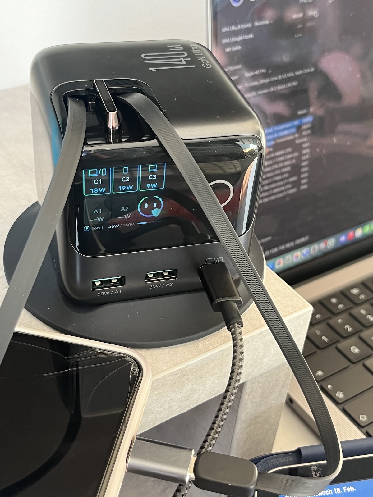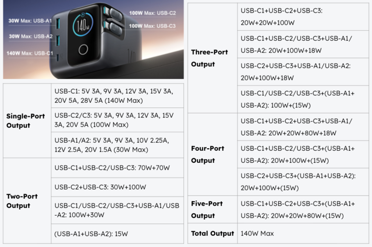 Ami a leadott teljesítményt illeti, a fenti értékek a maximális teljesítményt jelentik, ha csak egy készülék van csatlakoztatva (a töltő maximális teljesítménye 140 W). Ha például két eszköz csatlakozik a C1 és C2 portokhoz (C-típusú), amelyek megfelelően nagy teljesítményt képesek felvenni, akkor a rendelkezésre álló maximális teljesítményen osztoznak, és mindkettő 70 wattot ad le.