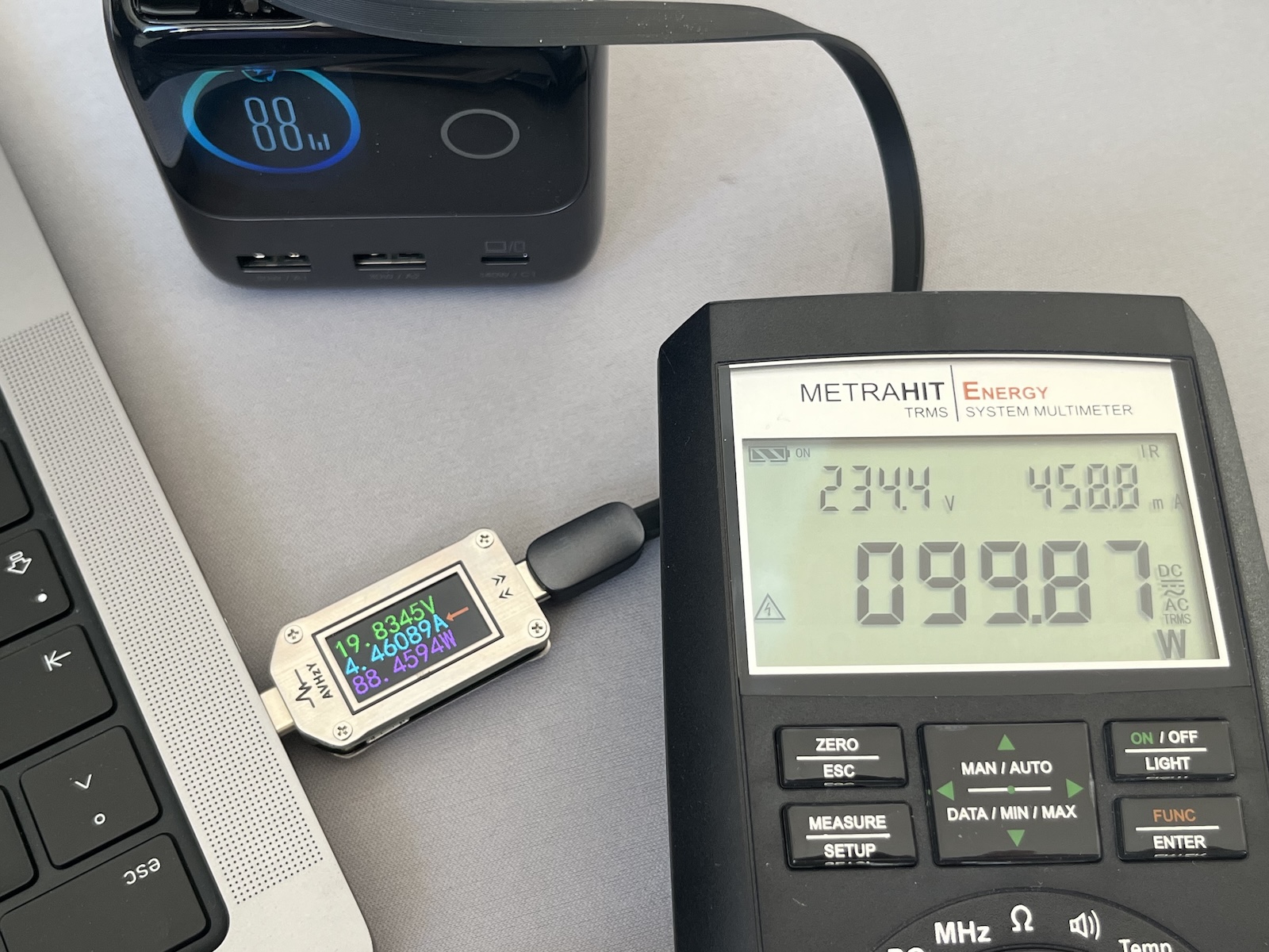 A hatékonyságot és a megadott teljesítményértékek pontosságát is közelebbről megvizsgáltuk. Ehhez egy kiváló minőségű Gossen Metrawatt multimétert és egy AVHzY USB-s teljesítménymérőt használtunk. Összehasonlításaink szerint a csatlakoztatott fogyasztók kijelzőn megjelenített teljesítményértékei 0-5%-os eltérésen belül egyeznek.
