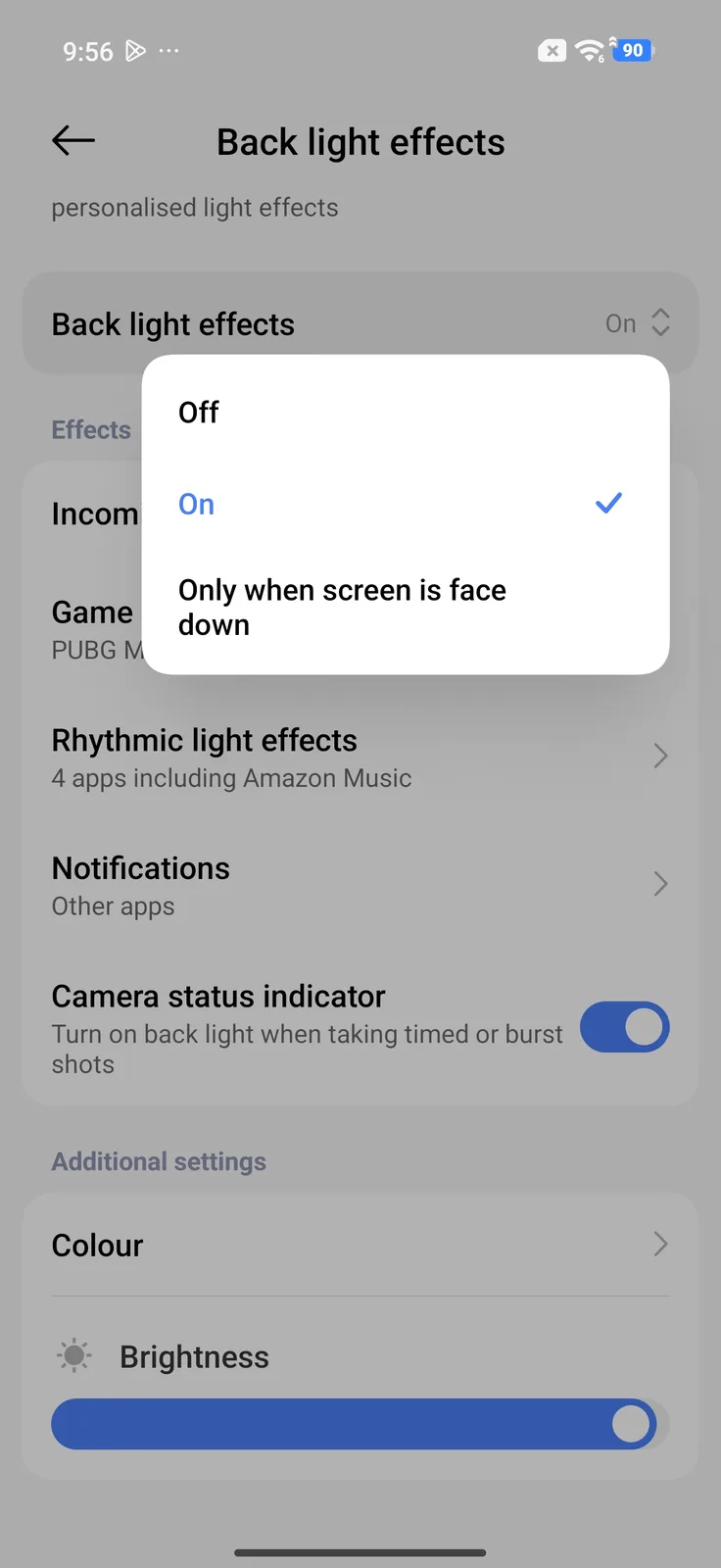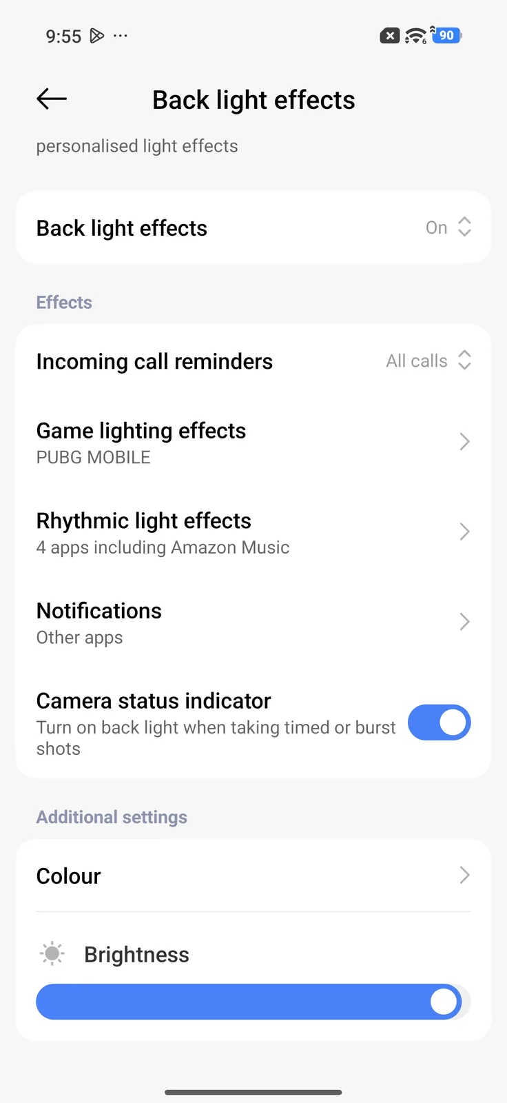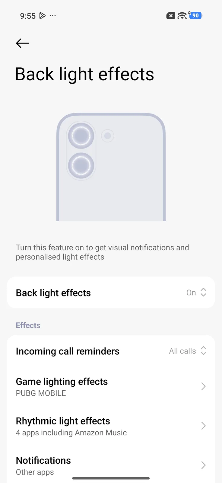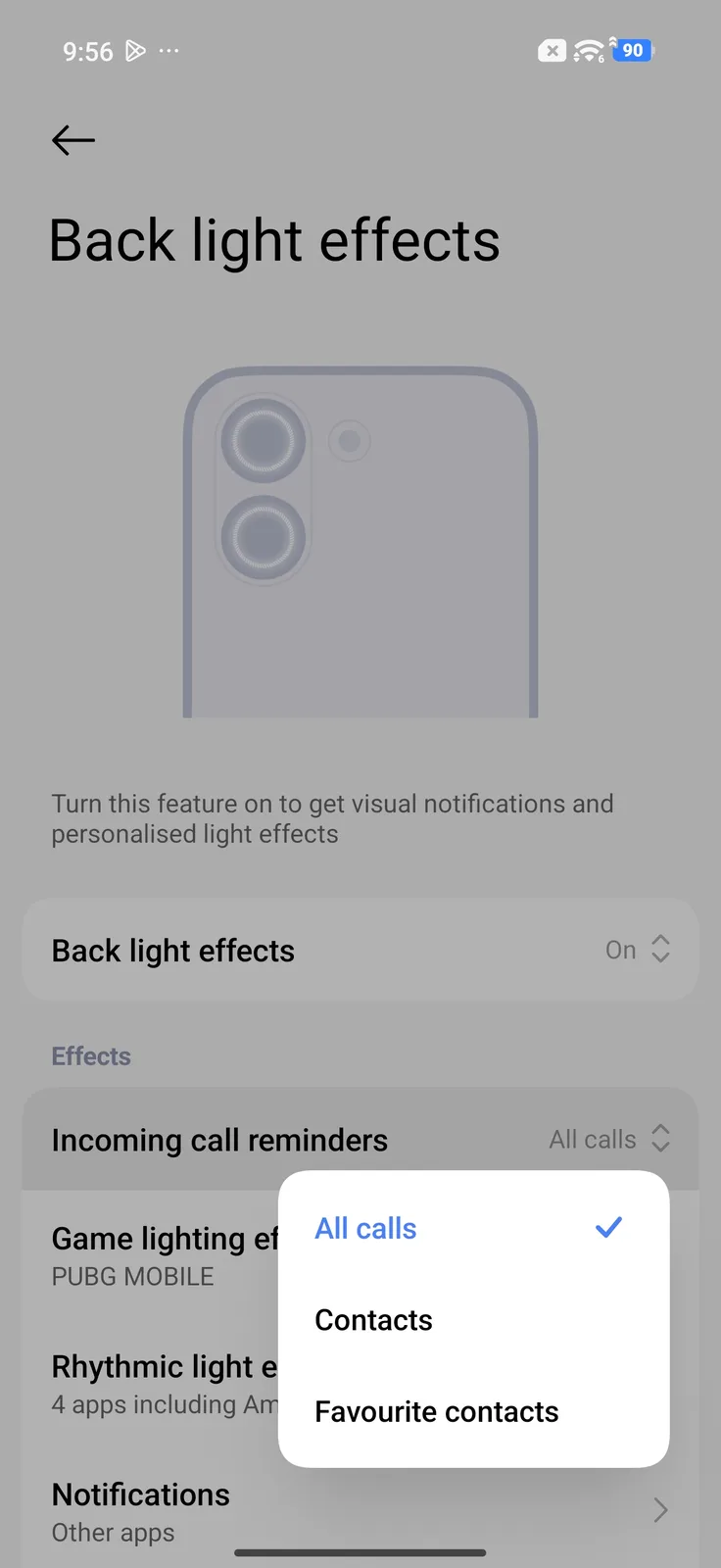 A beállítások menü számos lehetőséget kínál arra, hogy bizonyos alkalmazásokhoz vagy kapcsolatokhoz egyedi fényanimációkat rendeljünk.